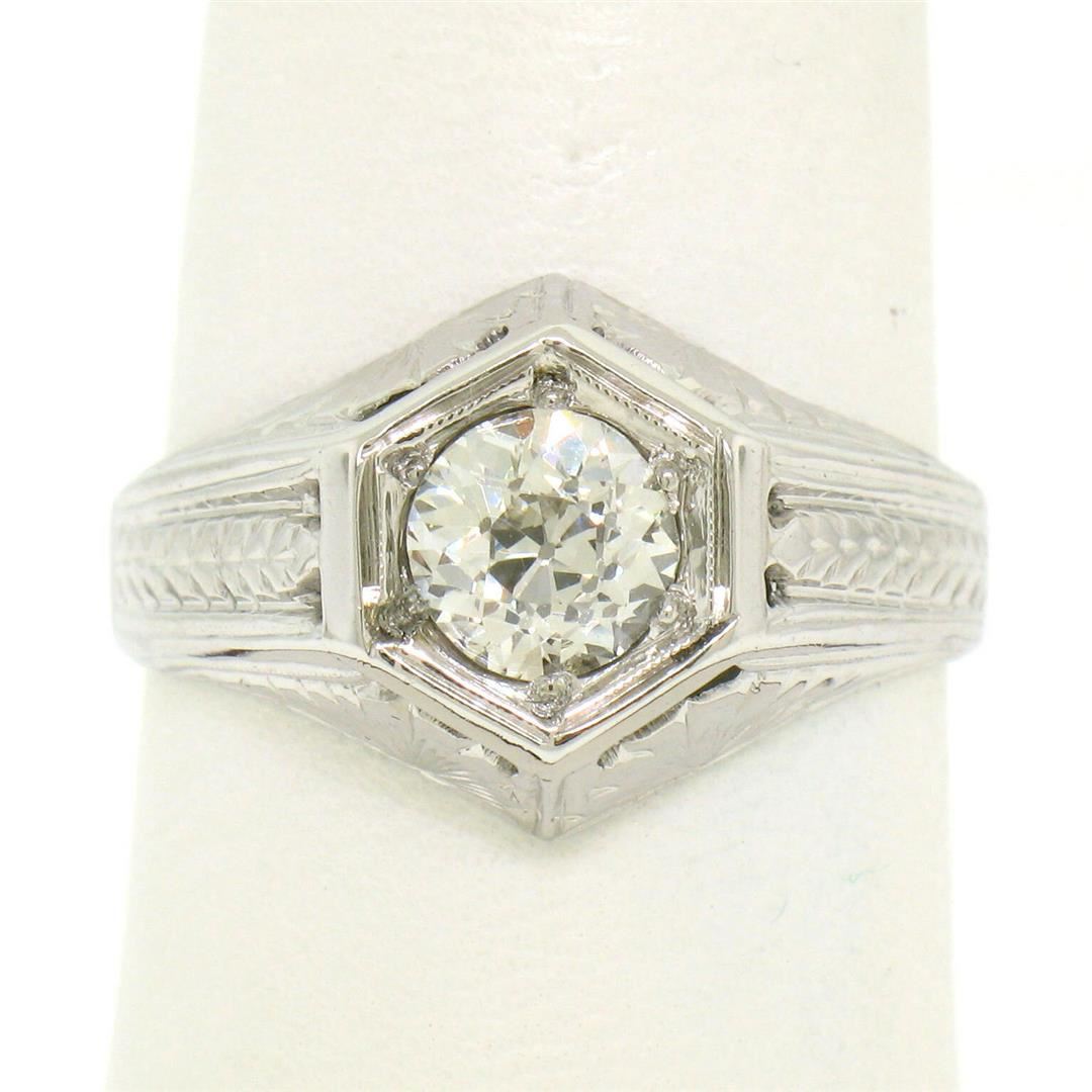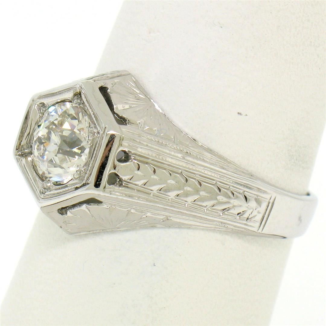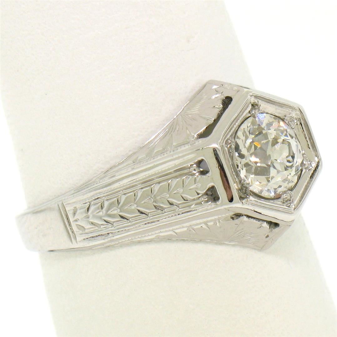 One Art Deco Etched Unisex 18k White Gold 0.85ct European Cut Diamond Solitaire Ring. Item Details: Material: 18k Solid White Gold, Weight: 3.8 Grams, Stone(s): (1) Natural Genuine Diamond - Round European Cut - Prong Set - H Color - VS1 Clarity, Total Carat Weight: 0.85 (approx.), Ring Size: 7.75 (We can custom size this ring.), Ring Width: 12.27mm, Ring Height: 5.32mm rise off the finger, Condition: Antique, Art Deco period piece. Excellent condition!