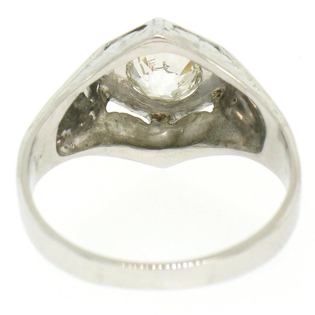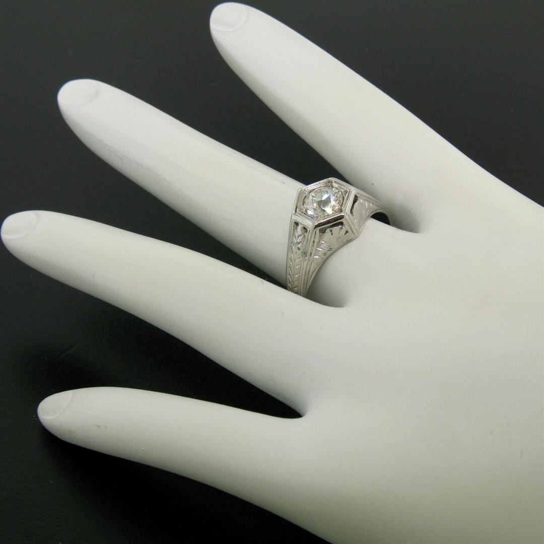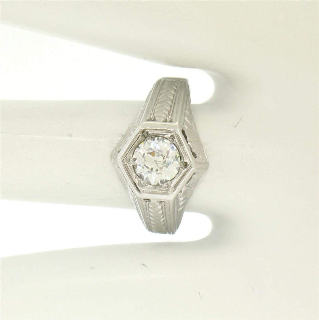 One Art Deco Etched Unisex 18k White Gold 0.85ct European Cut Diamond Solitaire Ring. Item Details: Material: 18k Solid White Gold, Weight: 3.8 Grams, Stone(s): (1) Natural Genuine Diamond - Round European Cut - Prong Set - H Color - VS1 Clarity, Total Carat Weight: 0.85 (approx.), Ring Size: 7.75 (We can custom size this ring.), Ring Width: 12.27mm, Ring Height: 5.32mm rise off the finger, Condition: Antique, Art Deco period piece. Excellent condition!