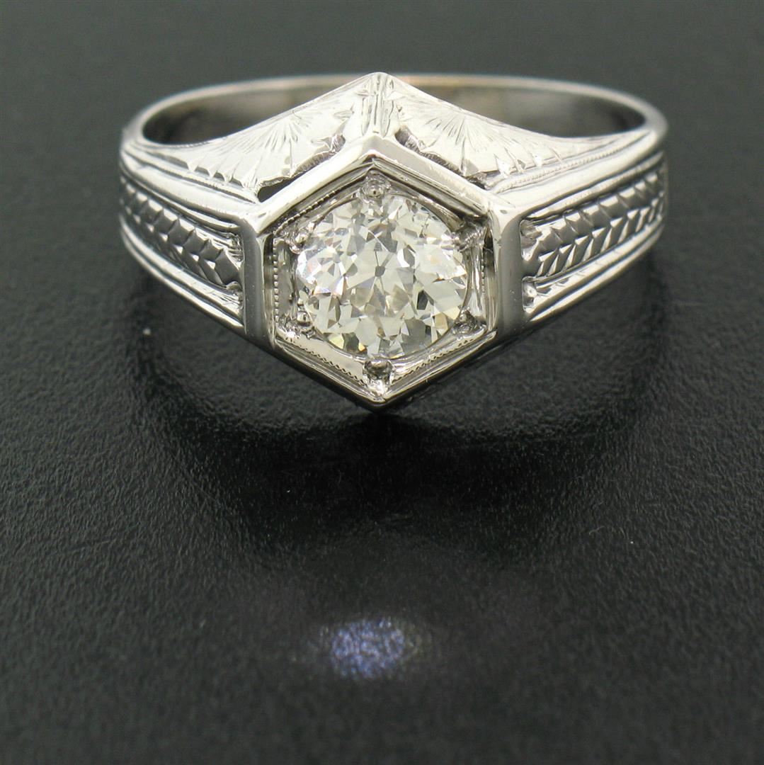 One Art Deco Etched Unisex 18k White Gold 0.85ct European Cut Diamond Solitaire Ring. Item Details: Material: 18k Solid White Gold, Weight: 3.8 Grams, Stone(s): (1) Natural Genuine Diamond - Round European Cut - Prong Set - H Color - VS1 Clarity, Total Carat Weight: 0.85 (approx.), Ring Size: 7.75 (We can custom size this ring.), Ring Width: 12.27mm, Ring Height: 5.32mm rise off the finger, Condition: Antique, Art Deco period piece. Excellent condition!