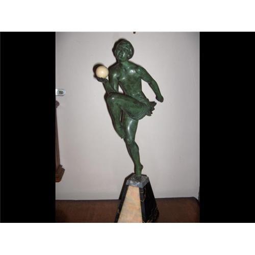 A stunning French Art Deco Statue c1925 in the style of Ferdinand Preiss of a Young Maiden of the Period balancing on one leg whilst holding a ball in her hand.Mounted on original marble pyramid .WE GUARANTEE AGE and AUTHENTICITY.