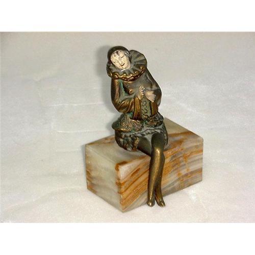 An Art Deco metal figure of a Harlequin sitting on a onyx base, 5 1/2'' tall, onyx base 4'' x 2 1/4''. Face and hands painted to resemble ivory. (chips to paint)