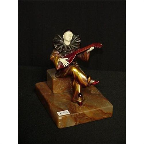 Seated Clown with a smile on his Ivorine face is playing his mandolin with Ivorine hands. The figurine is cast resin and is 6 1/2 inches high and is set on a 4 by 5 1/2 inch two step real marble base.