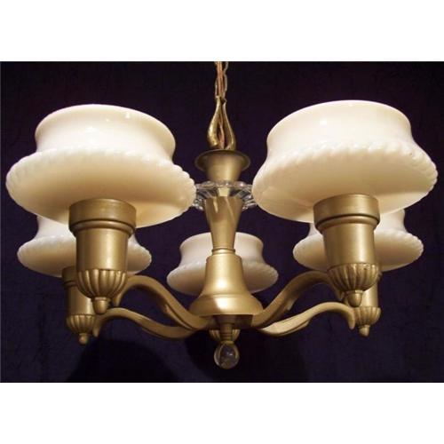 Very nice looking Art Deco chandelier with 5 arms and five lights. The custard glass shades have an unusual molded rope design around the middle. The chandelier dates to the early 1930's and still has it's original wiring that needs to be replaced. The fixture has a gold tone finish that looks great. There is a glass spacer with a petal like design in the middle. Measures 19" wide and 13" tall. The shades measure 7" wide at the middle, 4 1/2" wide at the top opening, and 2" at the bottom fitter. All 5 are in excellent condition, Just some roughness on the ends which is common in these shades. The ceiling canopy is included. Very nice looking deco period fixture.