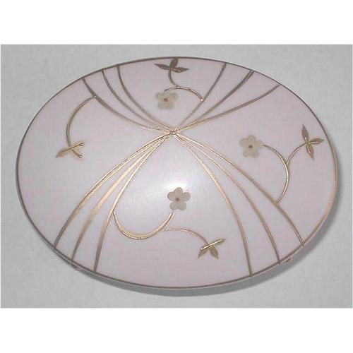 Fabulous and breathtakingly pretty. An oval shaped footed and lidded trinket box with two small oval pin trays inside. Very Art Deco, Art Nouveau styling in the design on the top of the lid which is raised painting and raised flowers - gold swirls, golden leaves and stems with gray flowers that have a little red "dot" inside each flower. Gold detailing at each foot of the bowl. The markings on the underside are: the original blue and silver foil label which has the Armart name and logo, two crossed arrows, the number 7816 and Japan. Measurements are 5-1/2" inches wide from east to west, 3-3/4" from north to south and it stands just under 2" inches. The two small pin dishes measure 4-3/4" inches wide by 2-3/4" inches from north to south. All pieces in perfect condition, absolutely no flaws. A stunning accessory for the vanity dresser or, indeed anywhere. <p>Shipping is determined after checkout; insurance is included. <p>