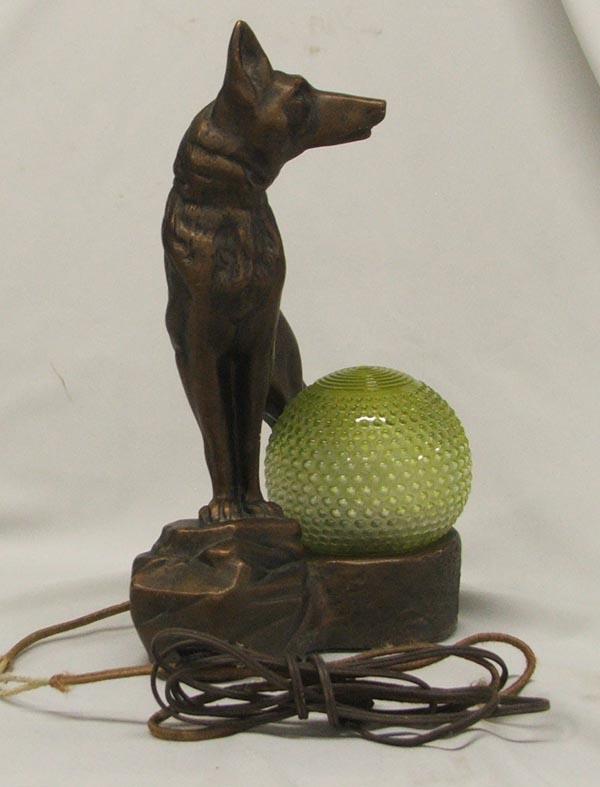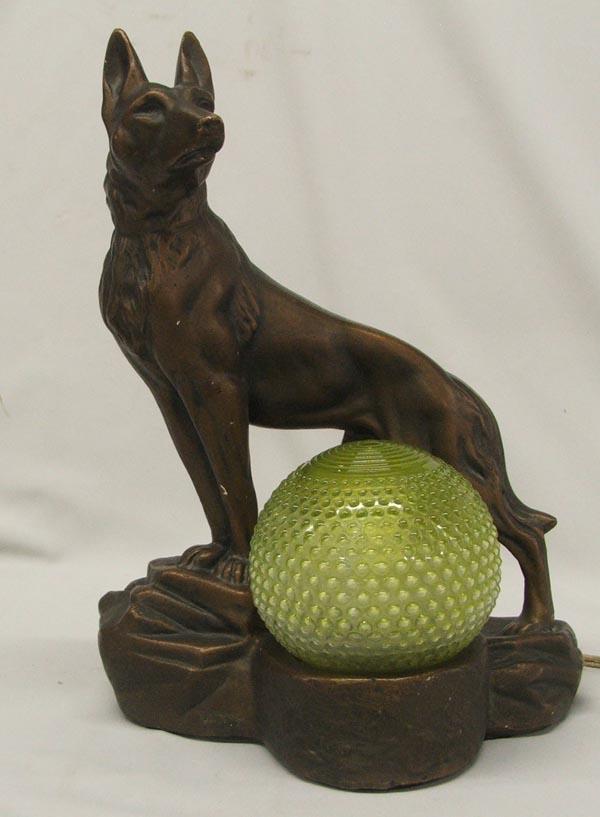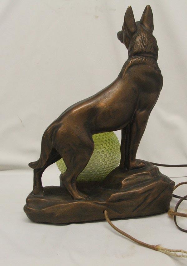 Art Deco German Shepherd Dog Mantle Lamp, measures approx. 15 x 11''. Looks like original globe. Composition/chalk. Lamp works but cord needs to be rewired. Buyers Pay Actual Shipping and Handling Charges(see terms and conditions for more information)