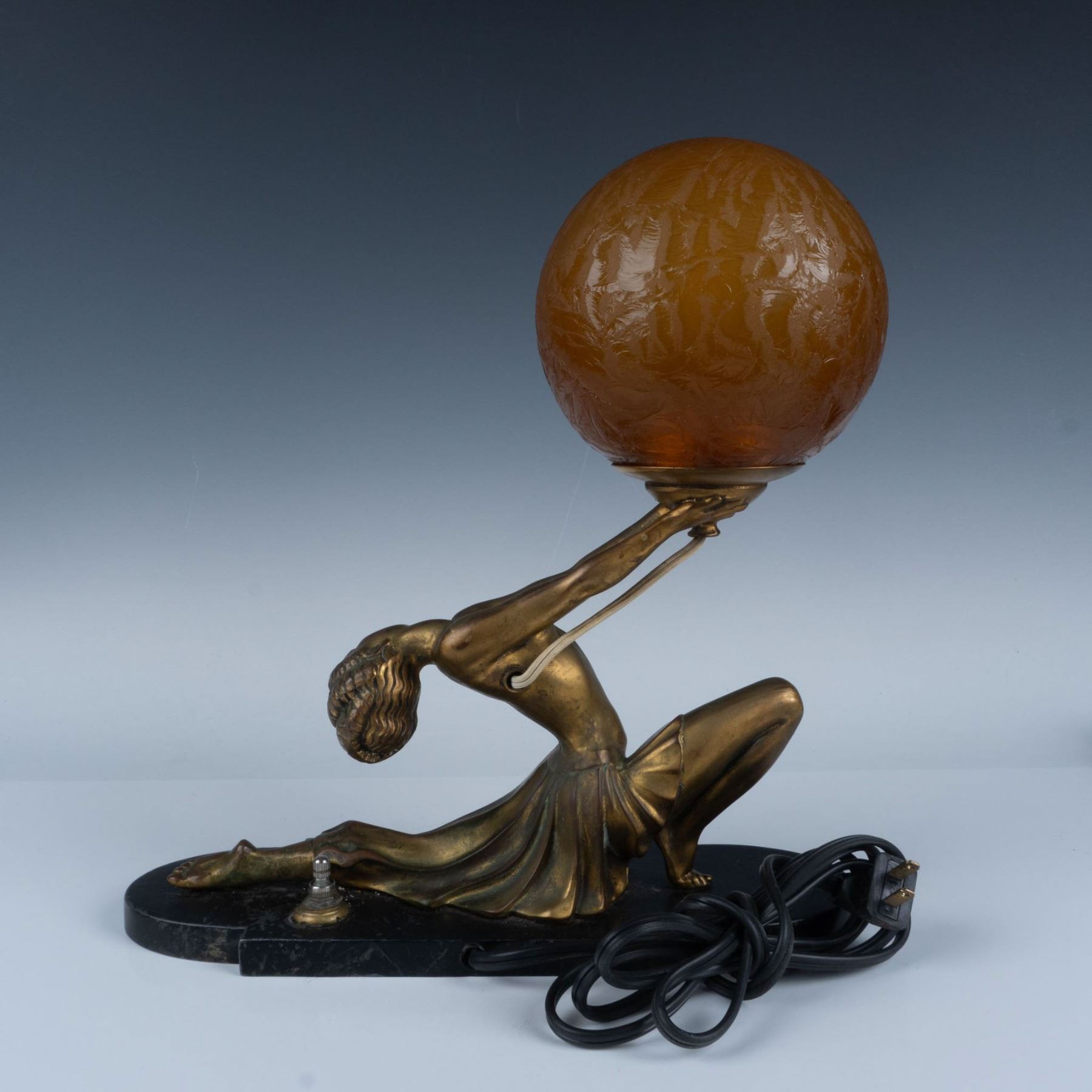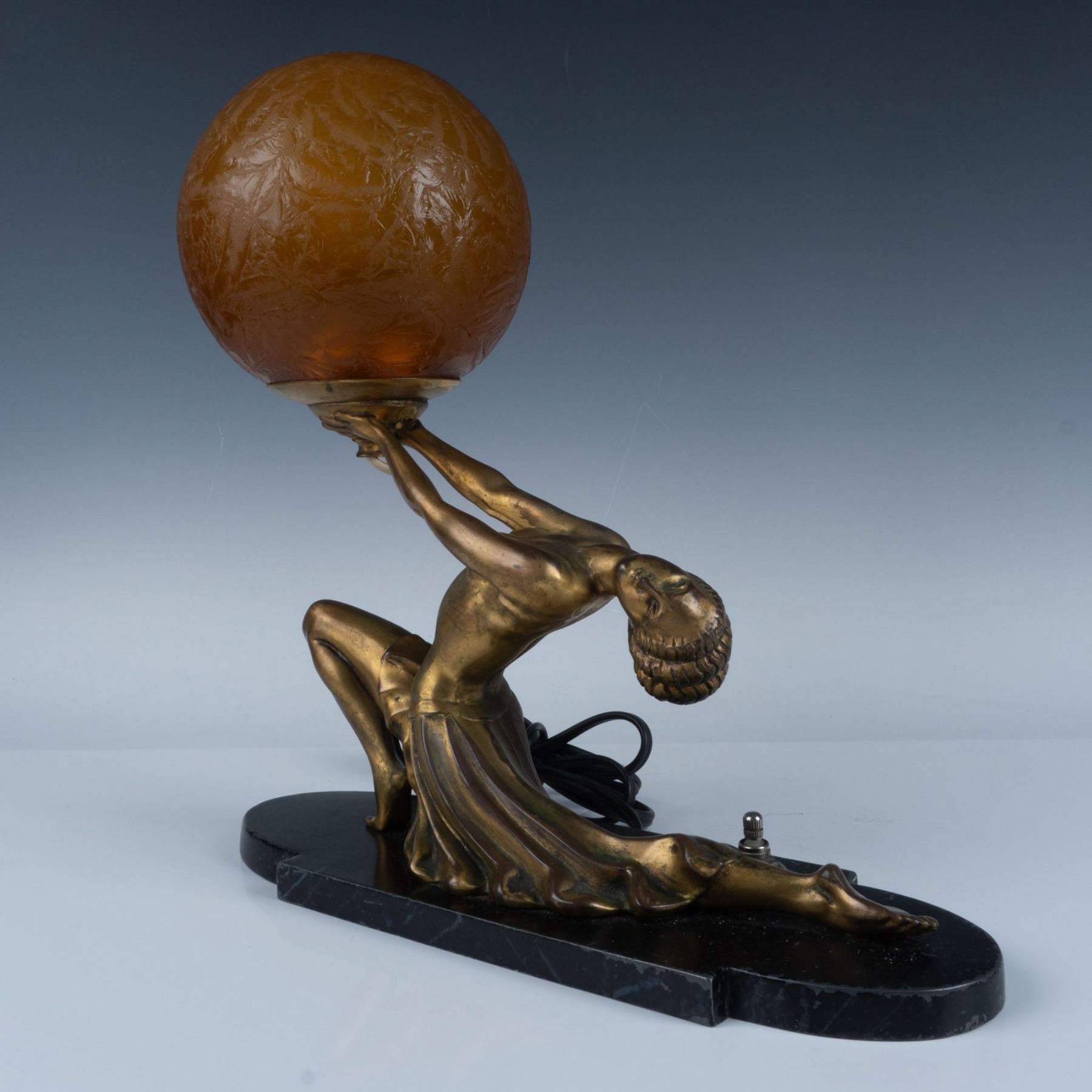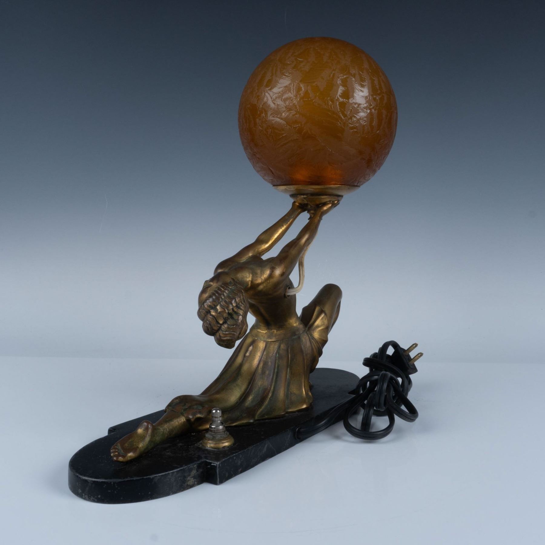 Stunning piece featuring a dancer holding an amber crackled glass globe as stands on a steel base with a black marble finish.