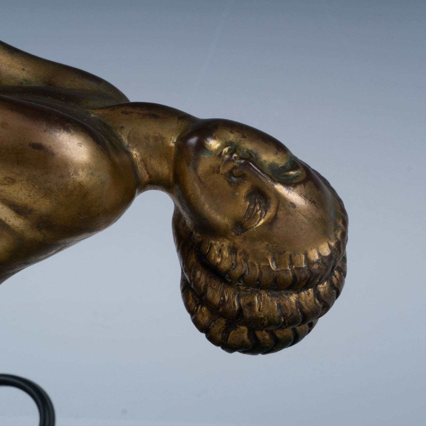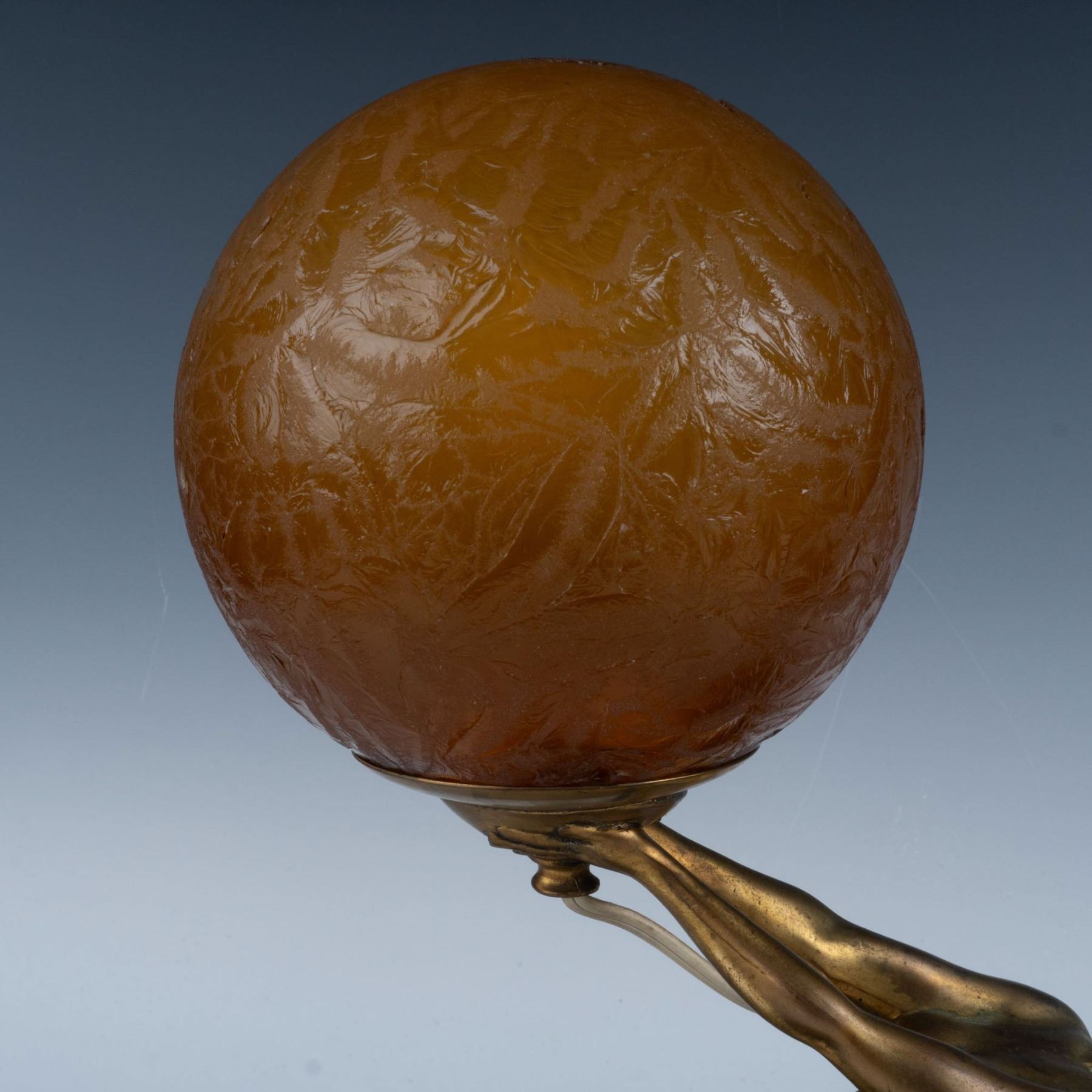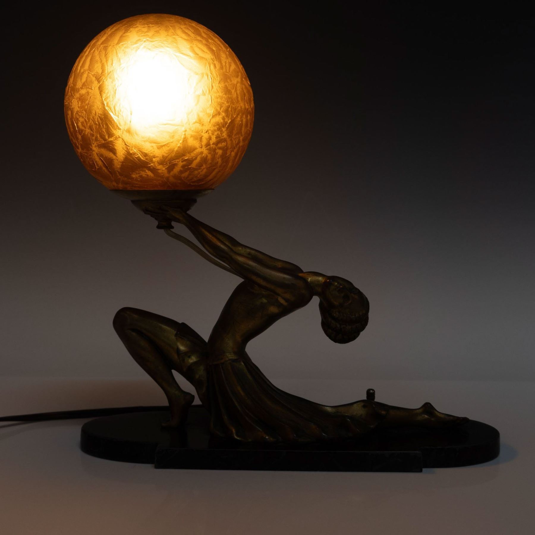 Stunning piece featuring a dancer holding an amber crackled glass globe as stands on a steel base with a black marble finish.