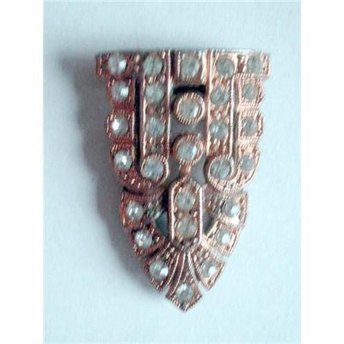 A gorgeous Art Deco dress clip with truly dazzling with sparkling rhinestones on a gilted or gilded background. Signed Goody on the back of the clip, which is strong and secure. All stones are intact, beautiful open work and elongated triangular design. Measures 1" in width by 1-1/2" in length. Excellent condition.