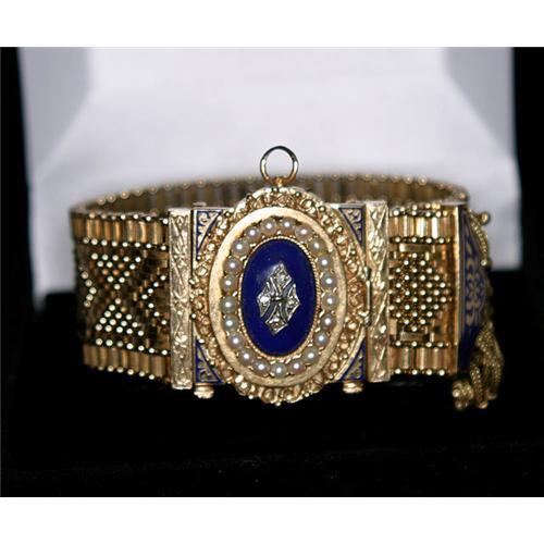 This Art Nouveau handmade watch is absolutely stunning and priceless. The workmanship is incredible. It breaks into three pieces with pin hinges. You can wear the solid gold bracelet with tassles and hand enamel work on it's own. You can wear it as a Swiss made Glycine watch. The watch cover is so beautiful. It has four diamonds set in white gold with millgrain work. This is set in a large oval piece of blue lapis. The lapis is surrounded by seed pearls. The workmanship is that of a fine jeweler. The clock can also be worn as a pendant as shown. (the necklace pictured is NOT included). The Bracelet is 7" long total and the watch pendant is 1 3/8" square. It's total weight is 49.0 grams. If you bid on this piece and do not win it, please visit my online store by clicking vendors items above to see if it is still available for direct sale or offers. .