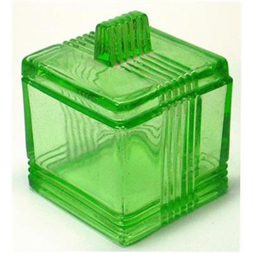 This lovely Art Deco powder jar was produced during the 1930s from glowing green Depression glass. Square shaped and featuring a serrated band that runs through the middle of three sides and includes the finial. It fluoresces brilliantly under black light, measures 3 inches cubed plus finial with both the lid and jar in excellent condition.
