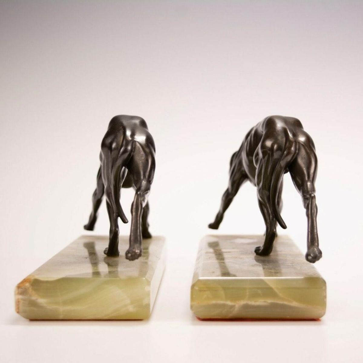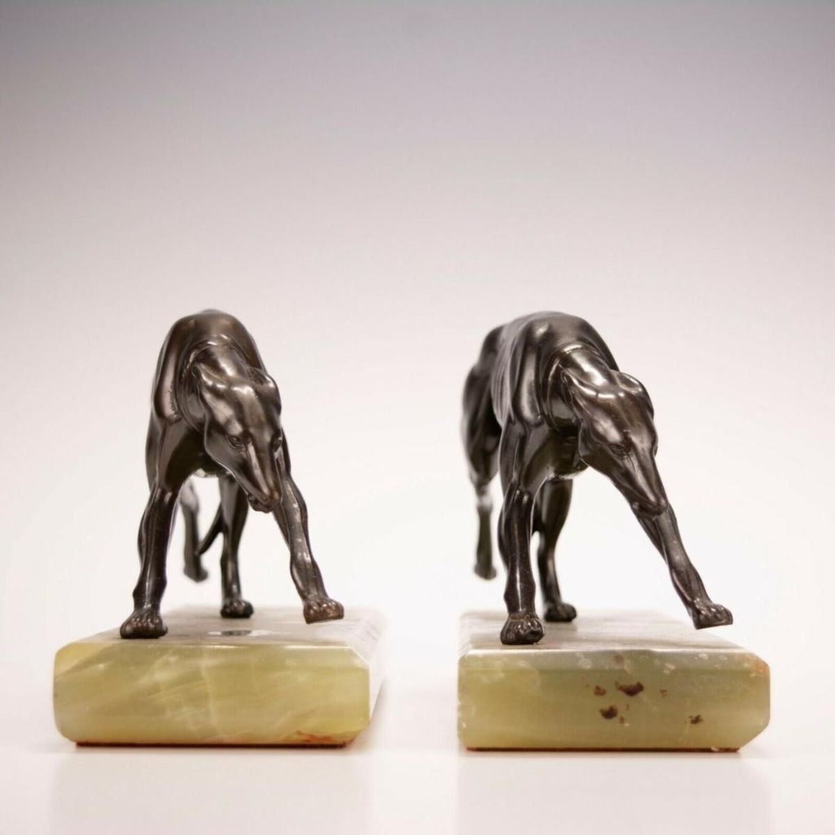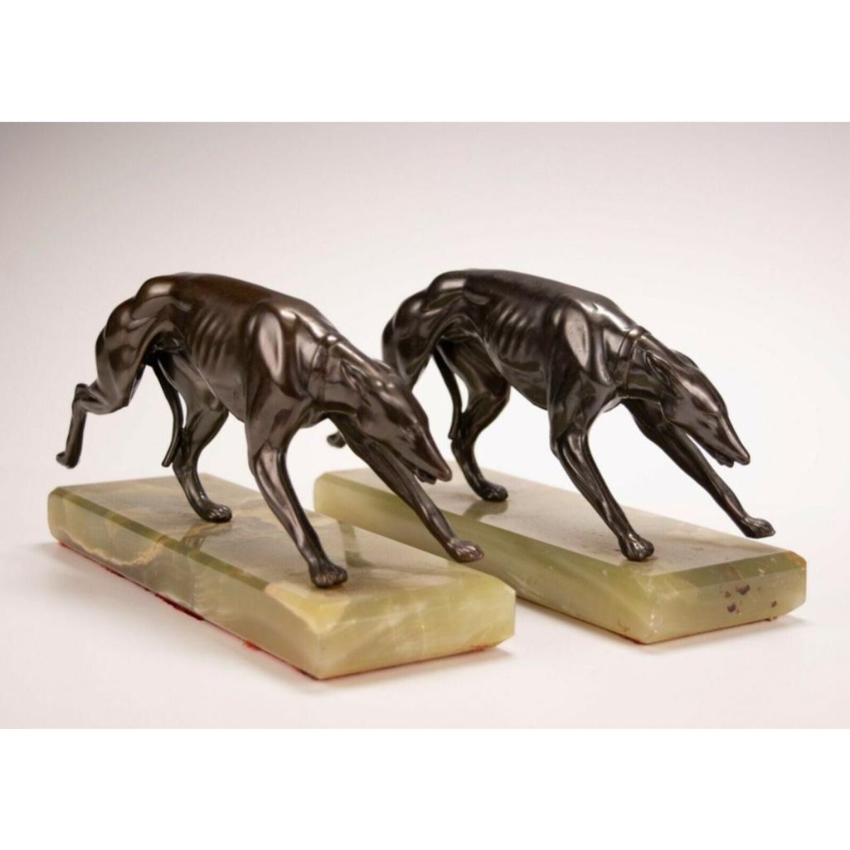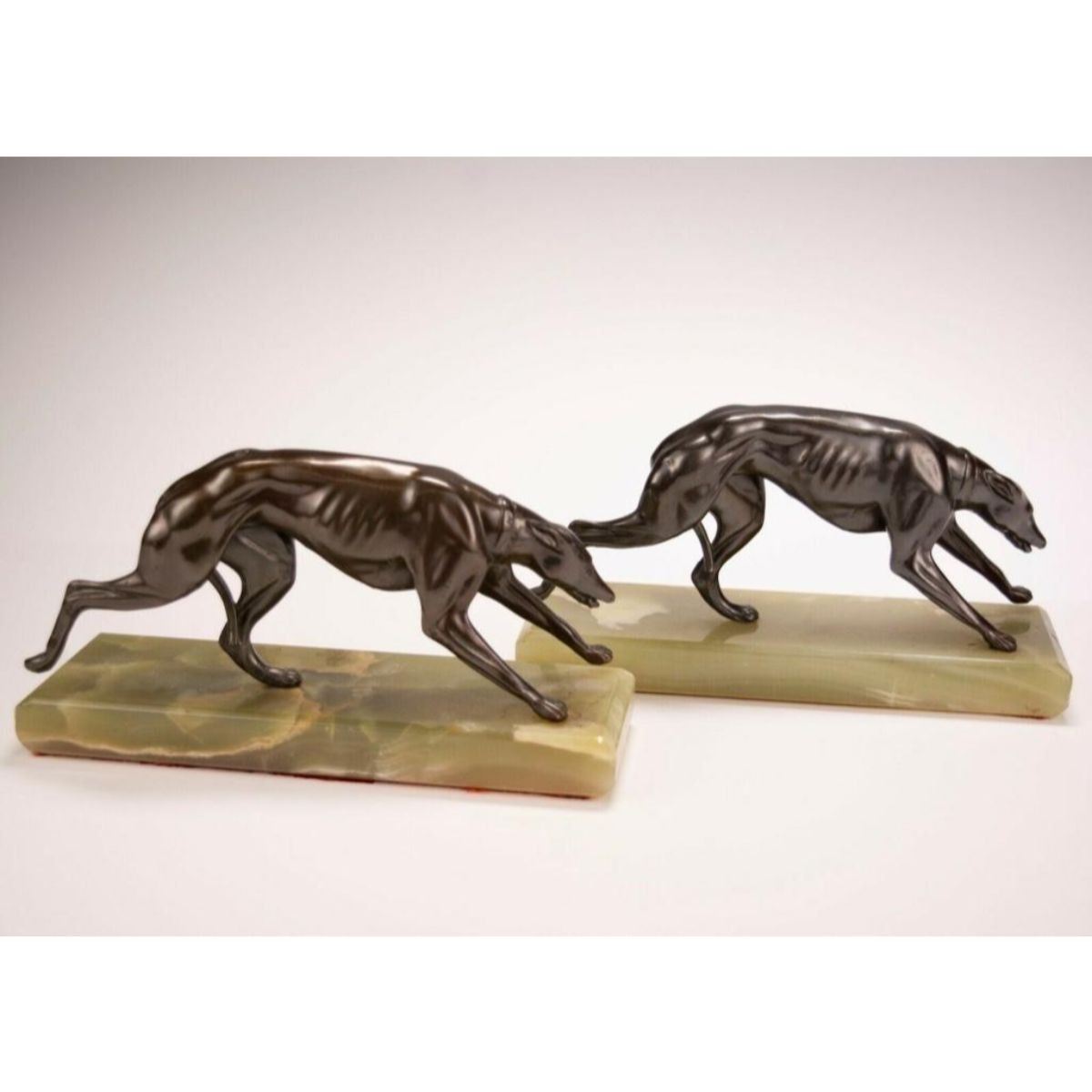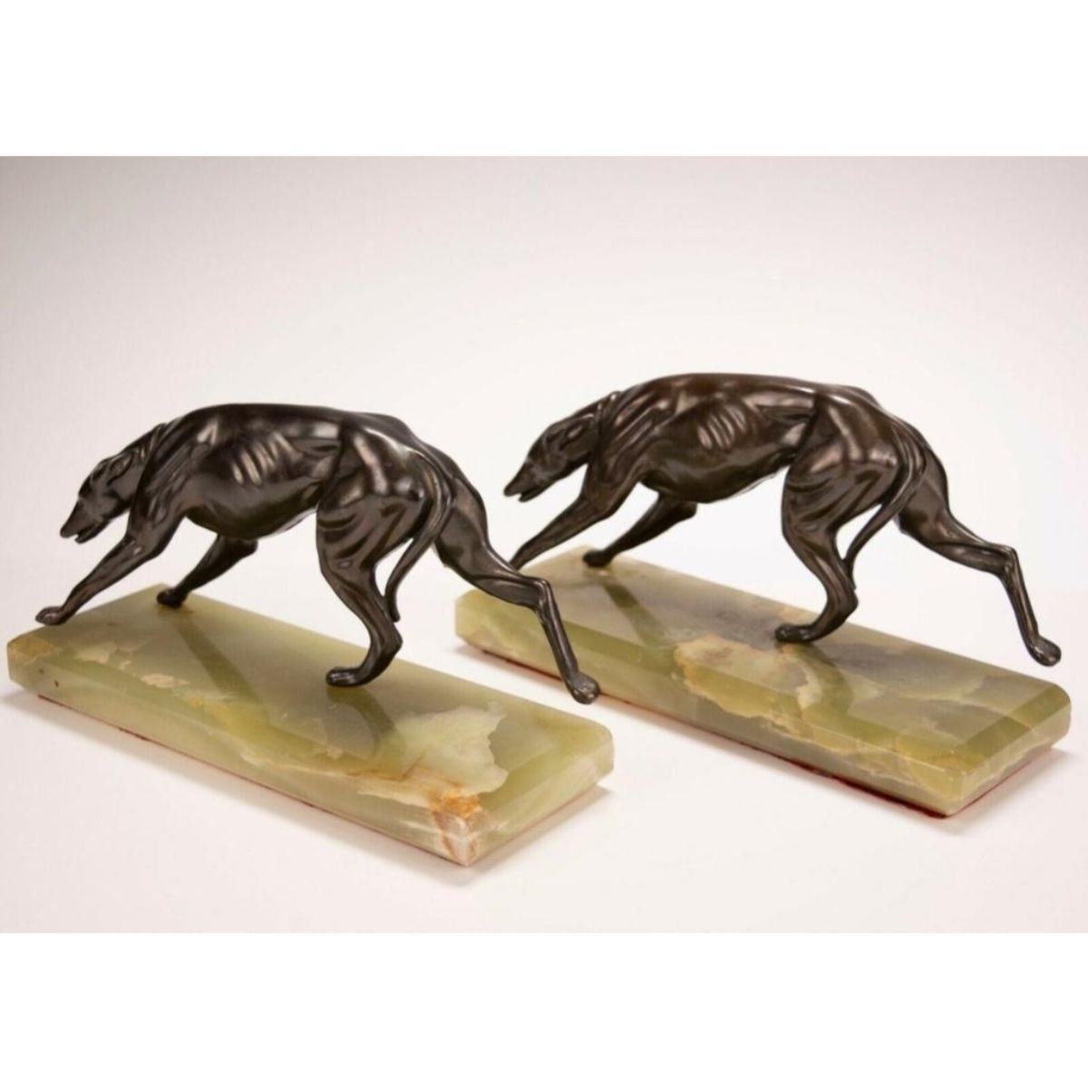 Pair of Art Deco era bookends, metal greyhound dogs mounted on green marble onyx base. Each bookend approximately 9" x 3 1/2" x 5". * a chip to the back corner of marble on one bookend & some dark staining on the front.Â