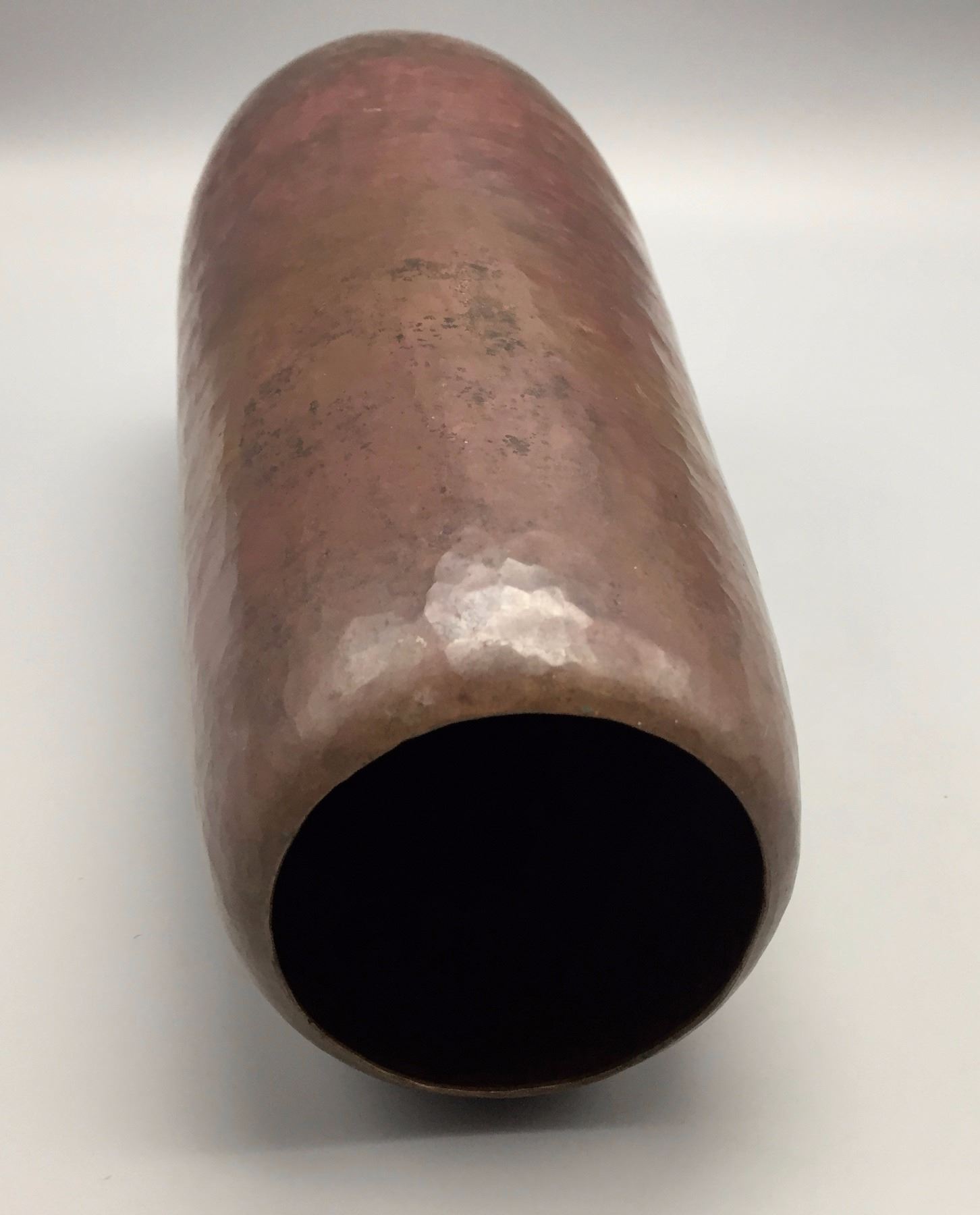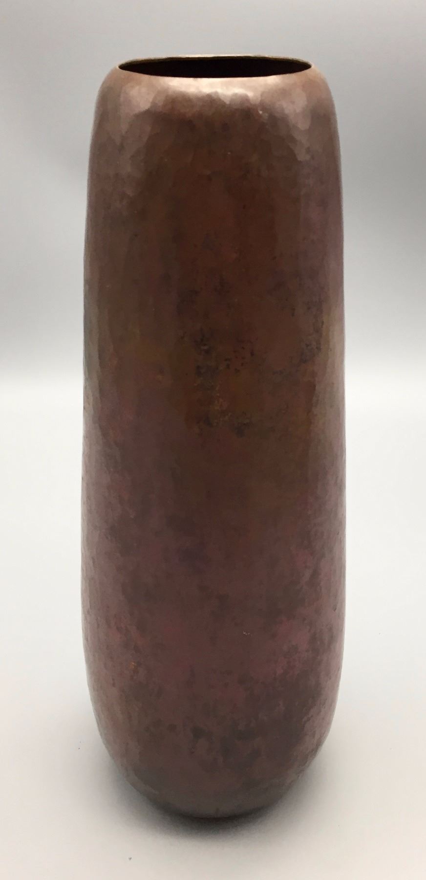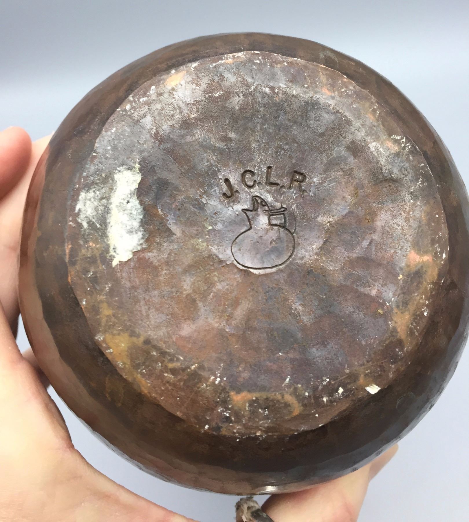 Maker: Signed J.C.L.R and a pottery insignia. Approx. Age: Circa 1920s - 40s. Size: 12” tall. Additional Info: Hammered copper pot. Condition: Good for its age, normal wear expected. Please look closely at the pictures - they are an important part of our description. Shipping: There will be a $7 handling / packaging fee for shipping this lot. The actual cost of postage will be added on top of that.