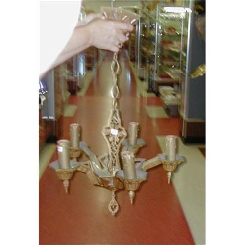 Exquisite art deco cast iron gold decorated hanging chandelier. It has 5 lights and great deco period detail. Probably needs rewiring. It is taller if all parts added. Buyer pays shipping and handling costs.