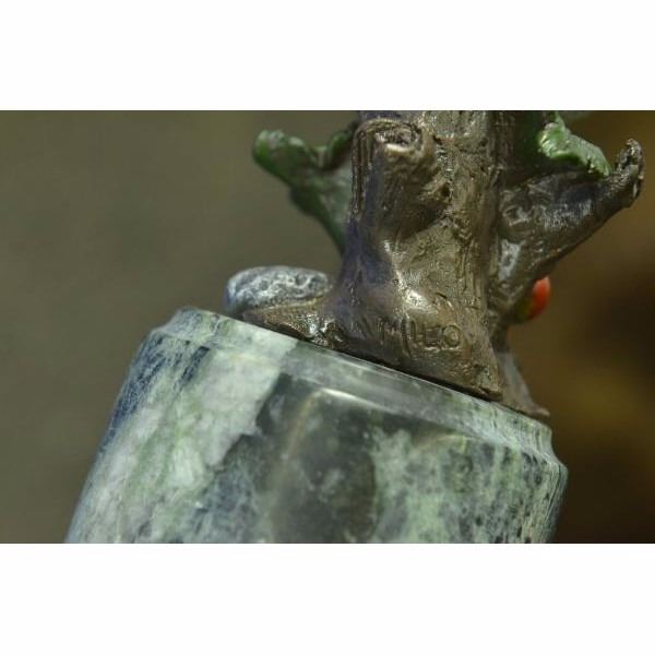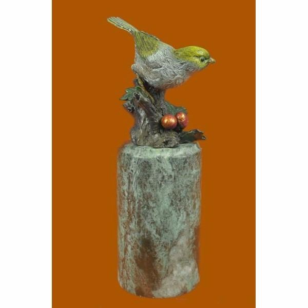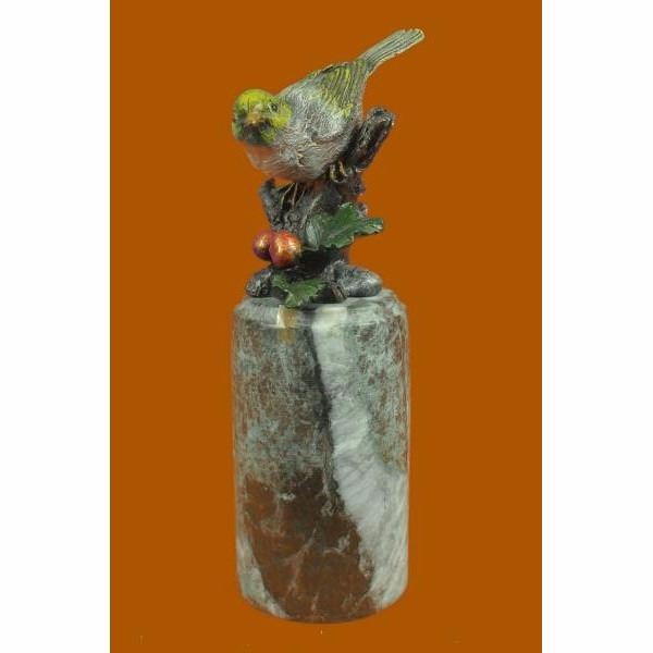 Birds of paradise. Perched on a brown marble base, the breathtaking multi color Finches figurines are a testament to nature's beauty, featuring wings of vibrantly colored real bronze. It is a great gift for nature lovers,fisherman, hunters and country dwellers. It may even be a sweet gesture to a lovely devoted couple on their golden anniversary. 100% bronze and handmade, this brown patina sculpture was cast using the "Lost Wax Method" and mounted on a brown marble base. It features the Art of Lost Wax and is signed by artist Milo. Condition: This sculpture is in perfect condition. Bronze Dimensions with Marble Base:Height 9" x Width 4" Marble Dimensions: Diameter 3". Height without base: 5" Weight : 4 LBS Inventory:28AL3062282