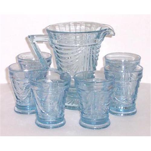 <tr><td>Title:Art Deco Ice Blue Glass Pitcher Tumbler Set</td></tr>