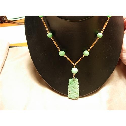 Stunning lady's circa 1930 14kt yellow gold and jade necklace set with 13 jade beads of graduating size in a beautiful fancy link gold necklace terminating in a carved floral rectangular shaped jade plaque - spring ring clasp. VERY VERY PRETTY PIECE