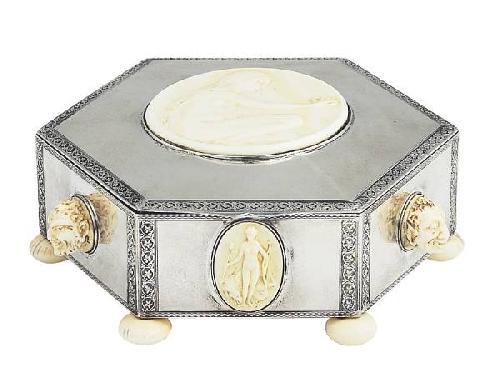Silver, 268 g, with ivory appliqués. Hexagonal case with hinged cover raised on flat oval feet, rolled decoration. On the sides there are plastic ivory satyr heads alternating with oval embossed medallions (Venus, Minerva, Diana). On the cover there is a relief depicting a naked girl holding a nest. (Marked: LS artist’s initials). Marked: German, circa 1920, A.W & Cie, import mark from Prague (1902-1921). Size: 12.5 x 11 x 4.4 cm