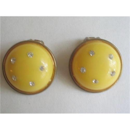 Lovely sunny lemon little beauties! Each earring has five little rhinestones - or crystals - embedded in to the lucite and rimmed in gold tone or brass around the outer edge. They are clip on and the brass coloured fittings on the back could be polished but I have left them in as found condition as I think the aged patina they have developed over the years really adds to their charm. They measure one inch in diameter, excellent vintage condition.