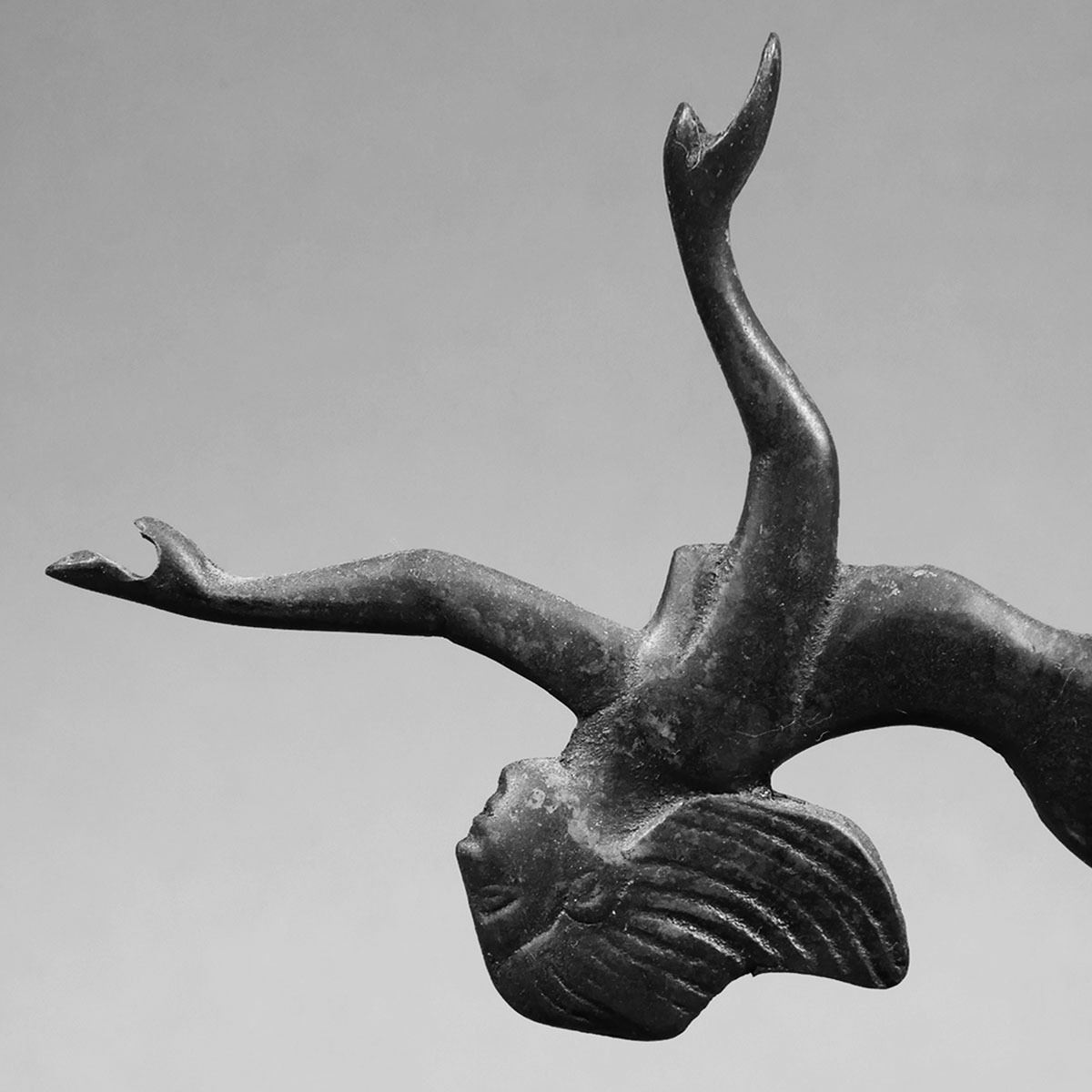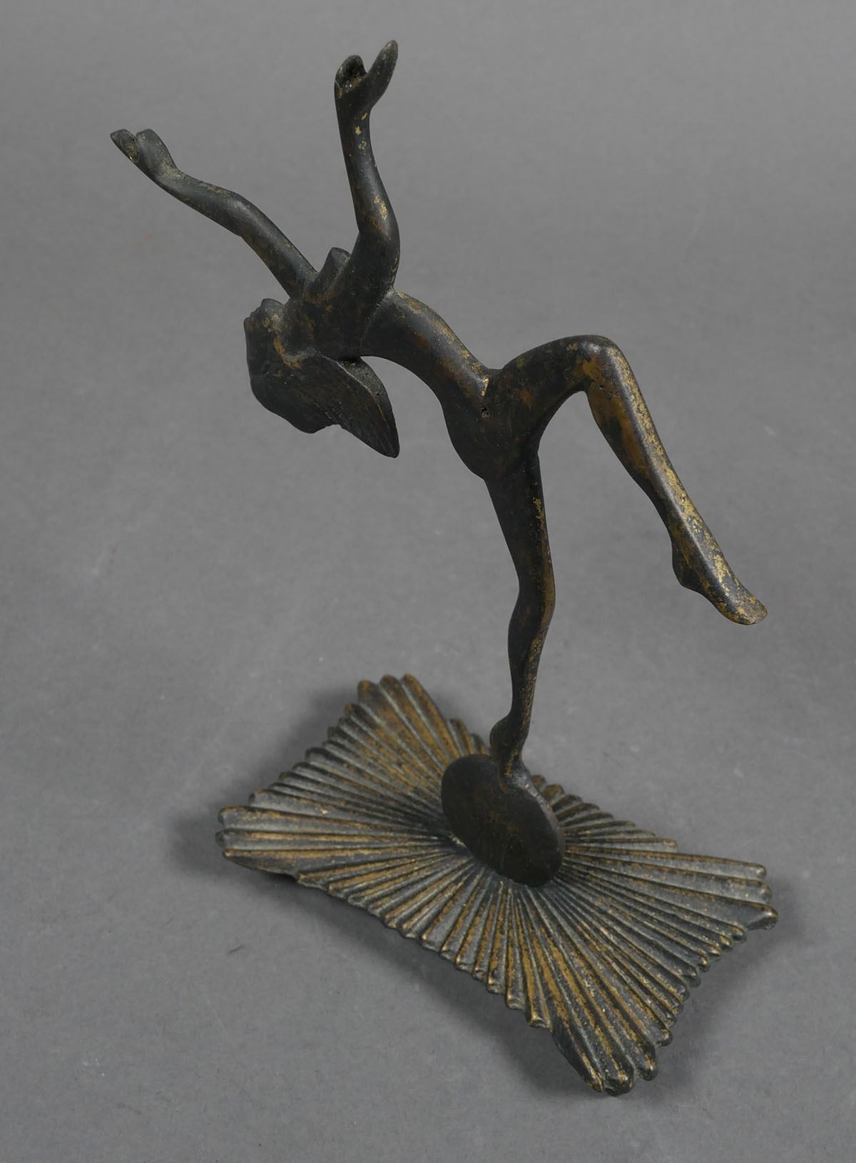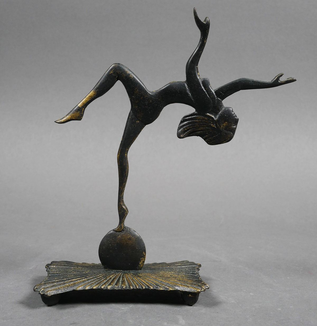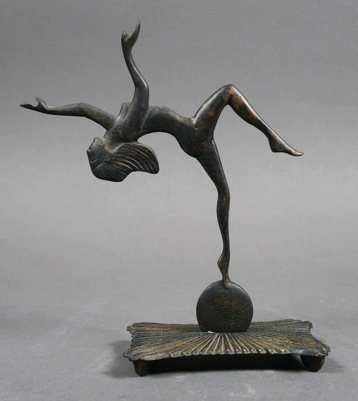 Art Deco metal nude woman sculpture balancing on ball, unmarked. Sculpture measures 7 1/4" tall x 6" wide x 2 5/8". Uniform patina, no cracks, chips or breaks. See photos for more details on condition.