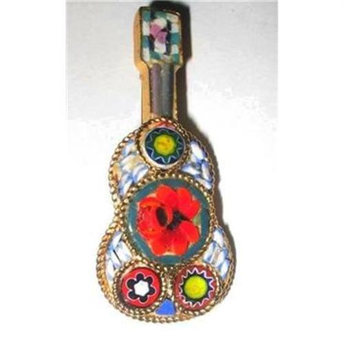 Such a pretty micro mosaic brooch in the shape of a musical instrument - guitar or mandolin. Tiny glass or ceramic tiles arranged in decorative and floral patterns. The tile colors are in shades of red, orange, light and dark blue, yellow, white and black. The tiles are set in a gold tone metal setting having textured rope or braided trim around the sides of the instrument. Measurements are 1-3/4 inches long and 3/4 inch wide with the old style C clasp. It is in excellent condition with no missing tiles. This brooch makes a lovely and very colorful wardrobe accessory, as well as a wonderful gift for a musician.