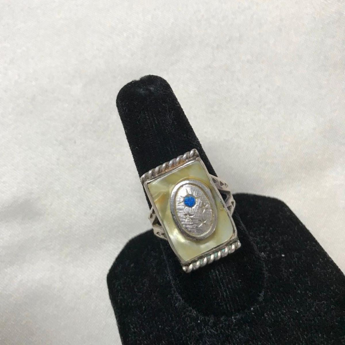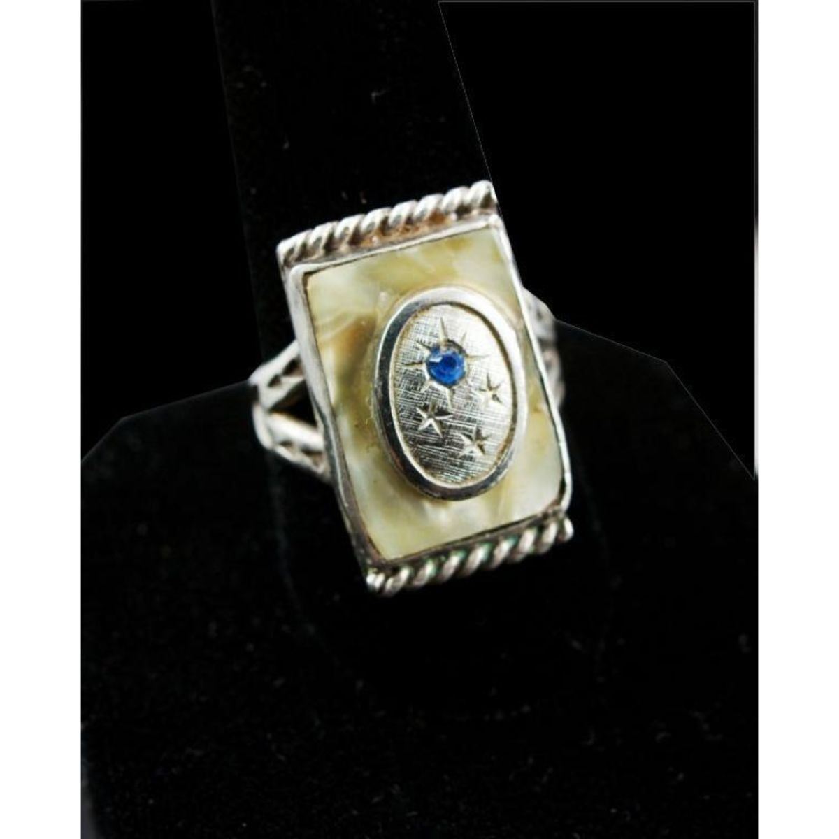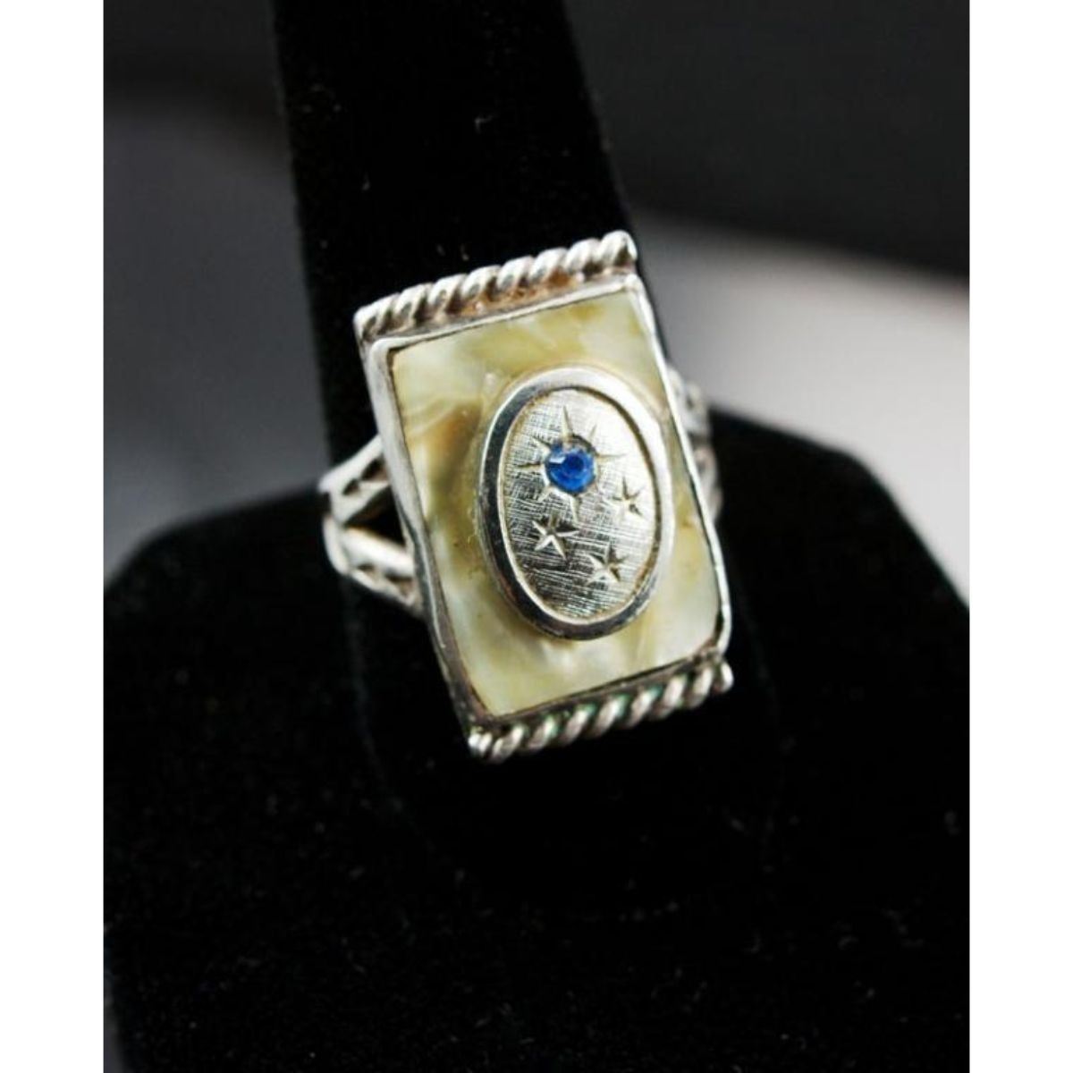 Art Deco era, mother of pearl men's ring with inset sapphire gemstone. Sterling silver. Approx size 8.5. Face of ring - ( 1/2" W X 1" L ).