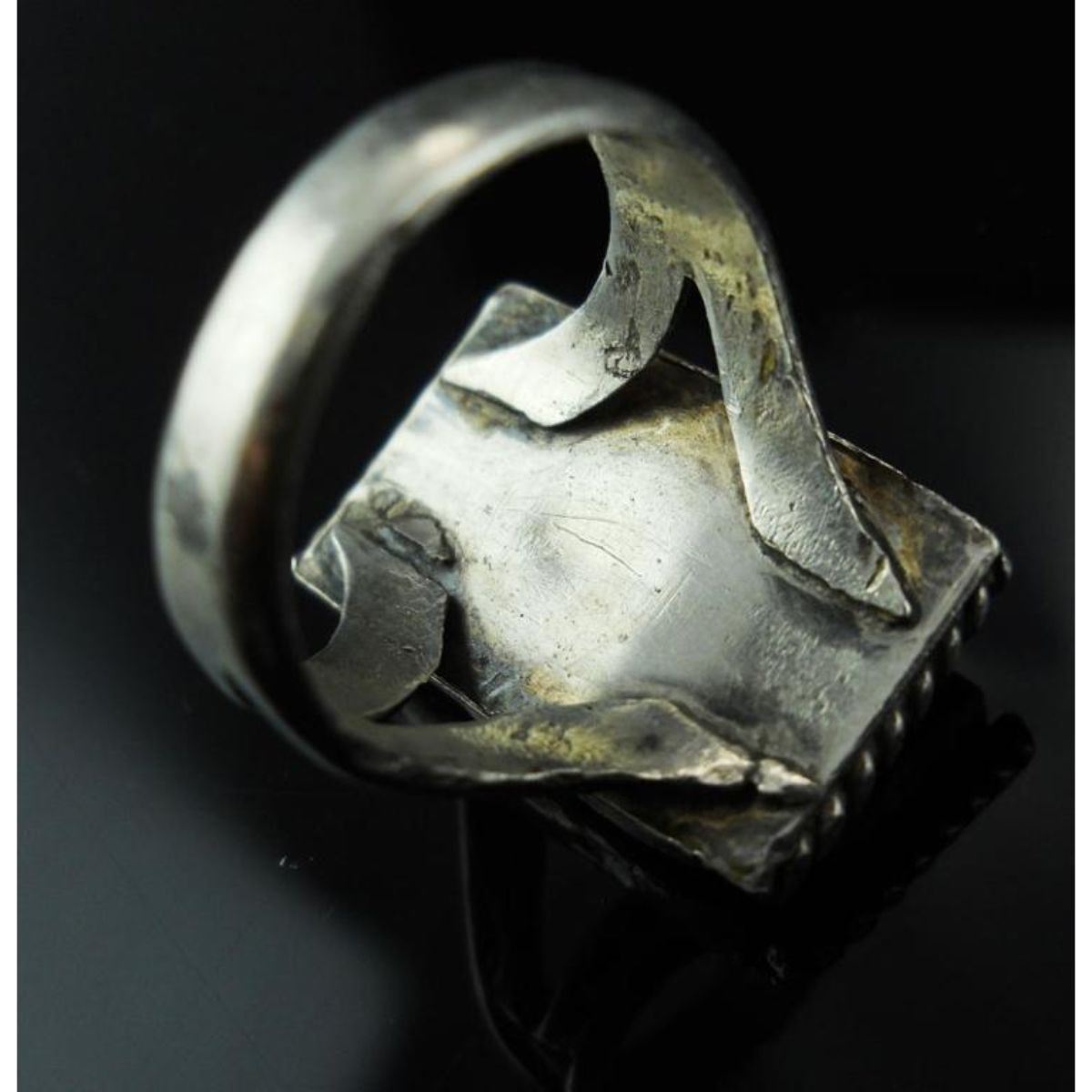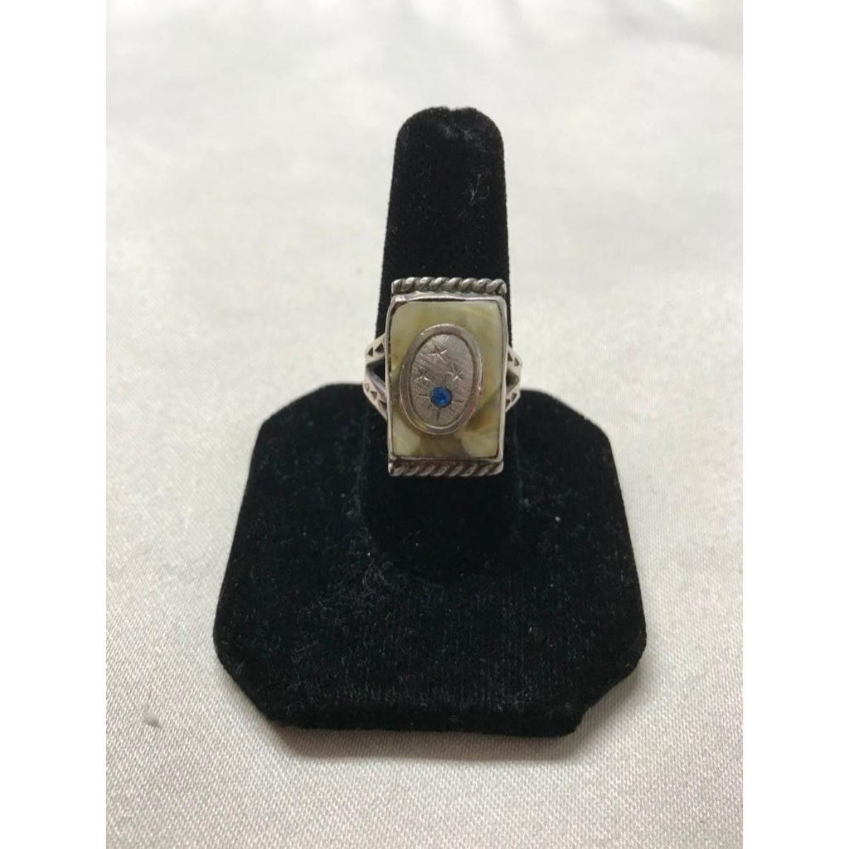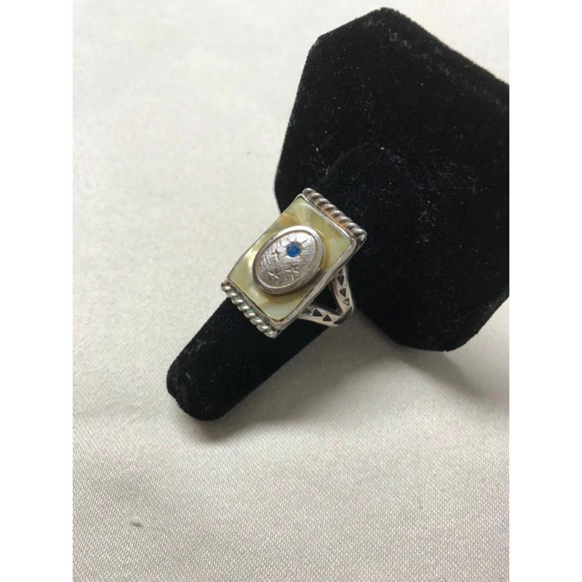Art Deco era, mother of pearl men's ring with inset sapphire gemstone. Sterling silver. Approx size 8.5. Face of ring - ( 1/2" W X 1" L ).