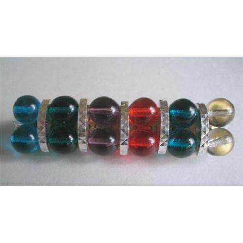Here is a very unique lucite brooch made up of a variety of jewel coloured translucent beads. The colours are, Ocean Blue, Royal Blue, Amethyst color, Ruby Red color, Teal Blue and Smoky Grey. After each set of two beads there is a silver tone, machine turned, diamond engraved vertical spacer. The size of the individual beads is 10m - the brooch measures 3" x 3/4" x1/2" inch in thickness. The back is brass and there is a safety closure. Wonderfully unique and in excellent vintage condition.