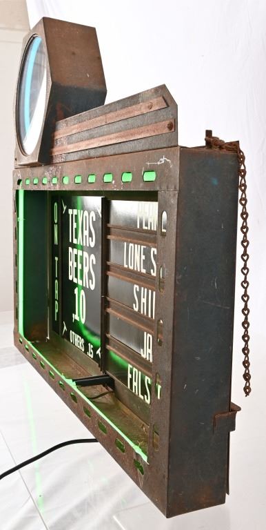 Featuring Texas beer selection. In good working condition, does have some patina, measures 8.5" x 29.5" x 33"