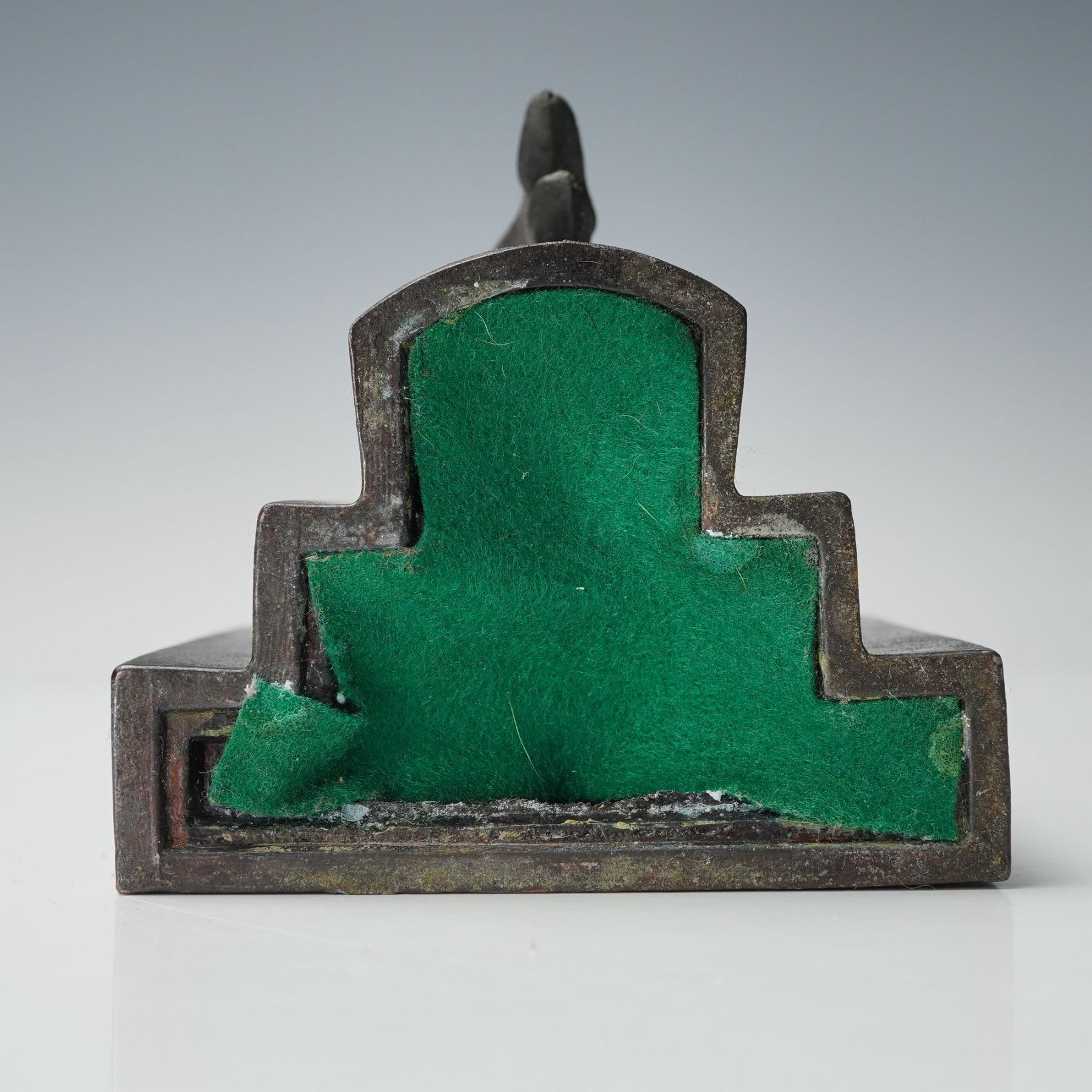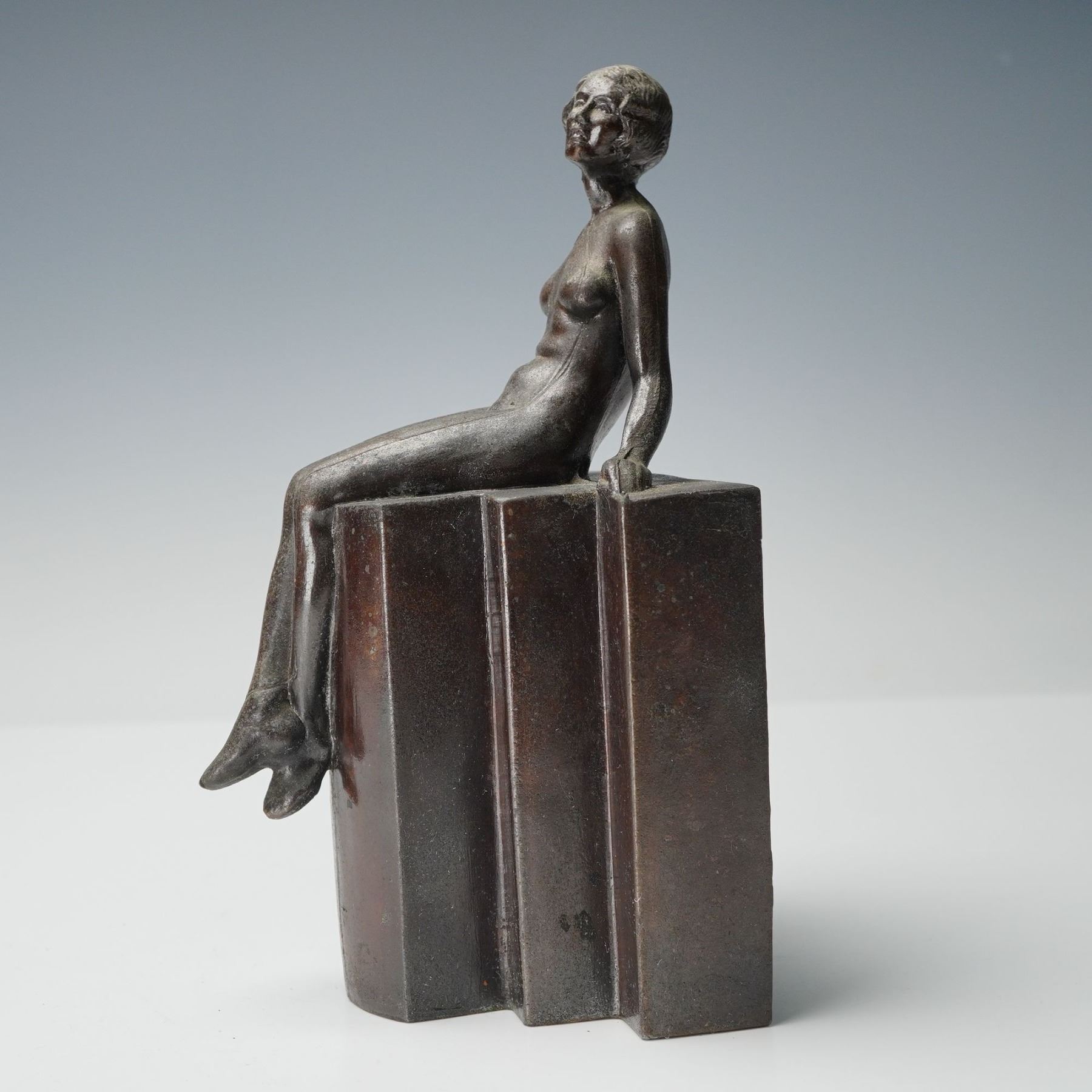 Elegant bronze bookend featuring a seated nude woman in a relaxed pose, characteristic of the Art Deco era. The figure rests atop a stepped geometric base that has a warm brown patina and green felt underside. A refined example of early twentieth century sculptural design blending modern form with classic grace.