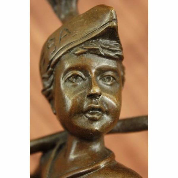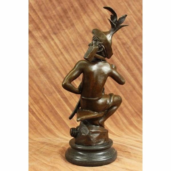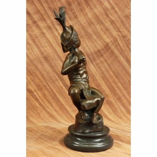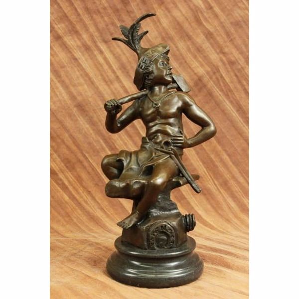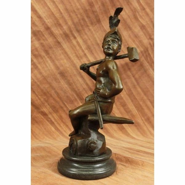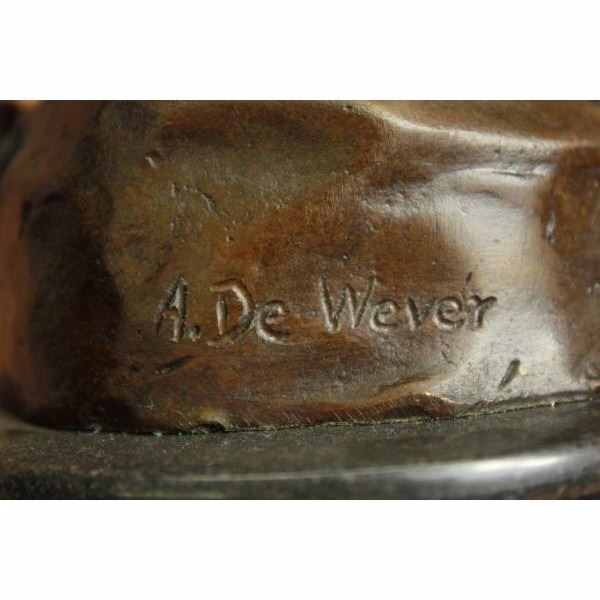 Auguste de Wever (Belgian 1836-1884): A Parcel real Bronze Figure of a boy having forged the Sword of Nothung, sitting and wearing a large sword and holding his hammer over an anvil on a tree stump in his right hand, broken arms at his feet. This powerful sculpture is finished with brown patina and is mounted upon a black marble base signed A. De Wever. Bronze Dimensions with Marble Base:Height 1 4 " x Width 7" Marble Dimensions: Diameter 5" Height without base: 12" Weight :10 LBS Inventory : 81DS6178218