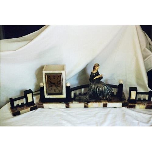 This is a marvelous Art Deco Onyx and painted metal Clock set decorated with painted metal figure of young woman reading to her borzoi by R. LULLIER circa 1925.