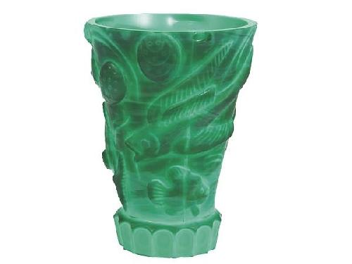 Pressed into form and cut, malachite green lythialin glass (fantasy name: jadeglass). Cut, fluted round base, conical shape body. Relief-decoration on the surface: seaworld. From the Ingrid serial. Chipped. Gablonz, after 1934, Curt Schlevogt. Size: 17.5 cm
