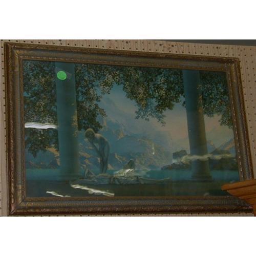 Great Parish print in shades of blue with old glass. 2" art deco frame. White lines due to flash. Buyer pays shipping and handling costs.