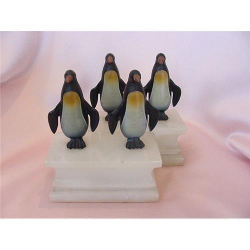 Wonderful pair of Art Deco bookends with two polychome penguins on each bookend. Each penguin measures 3 1/4" tall and sits on a 2" tall base. Each carved white onyx base measures 4 1/2" by 2 1/2" by 2". Very good condition-only two tiny edge chips on onyx edge and a tiny spot of missing paint. Heavy weight- almost 3 lbs. each. Sure to make you smile! Circa 1925.