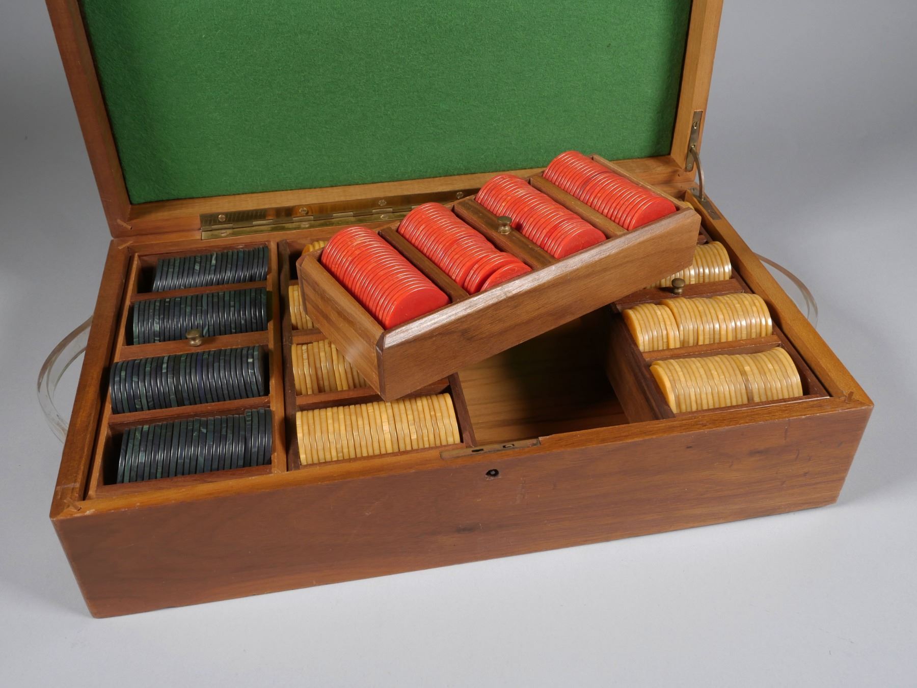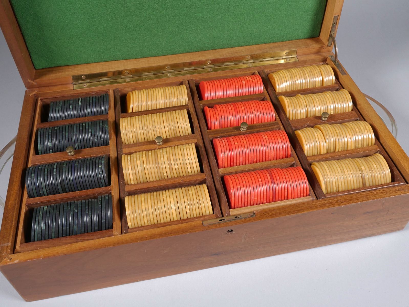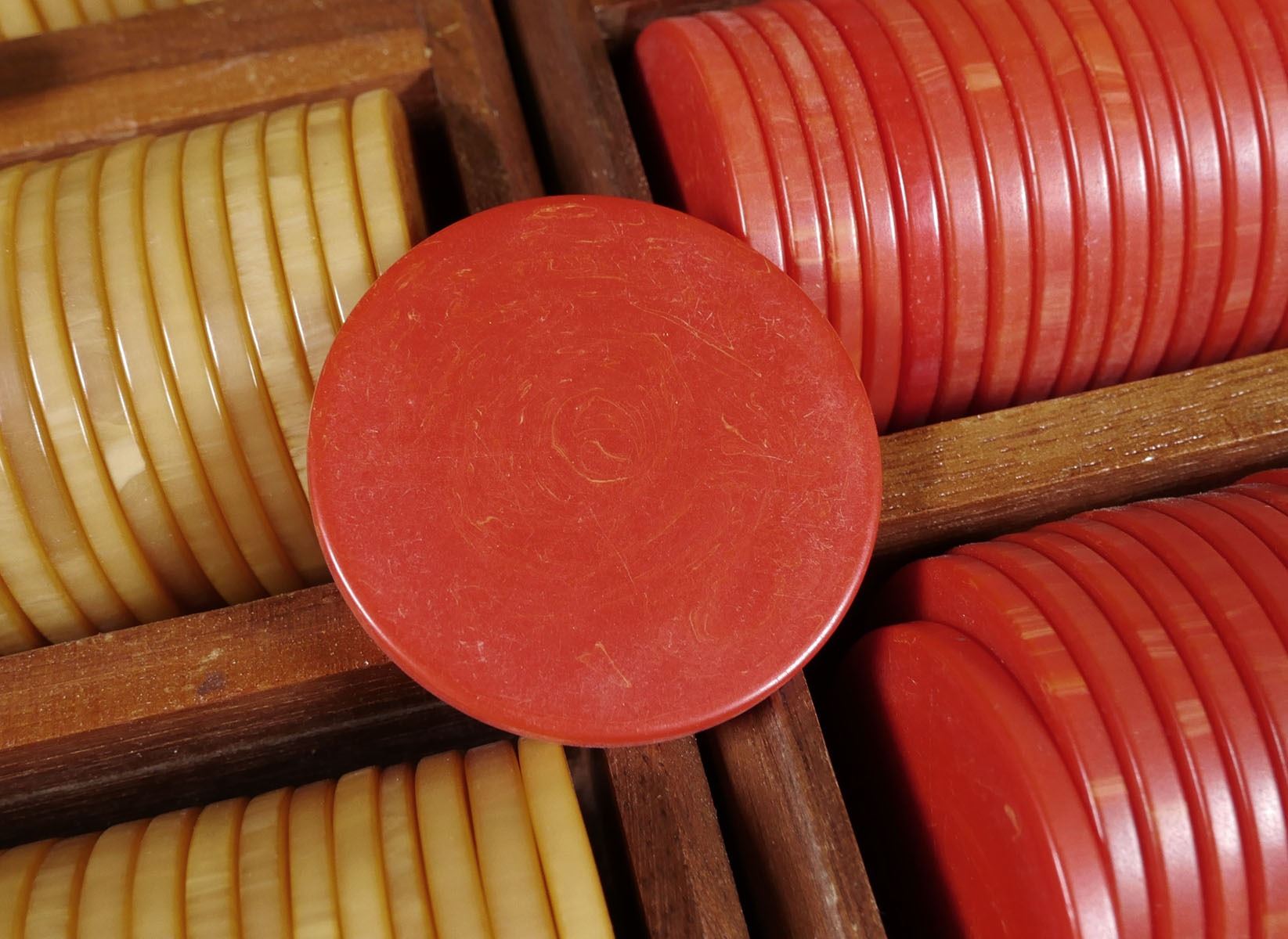 Early 20th century wood box with four racks of poker chips. Chips are swirled -- presumed to be celluloid -- and 1-7/16" diameter. Gold chips (200), red chips (98) and green chips (95). Box measures 15" x 9".