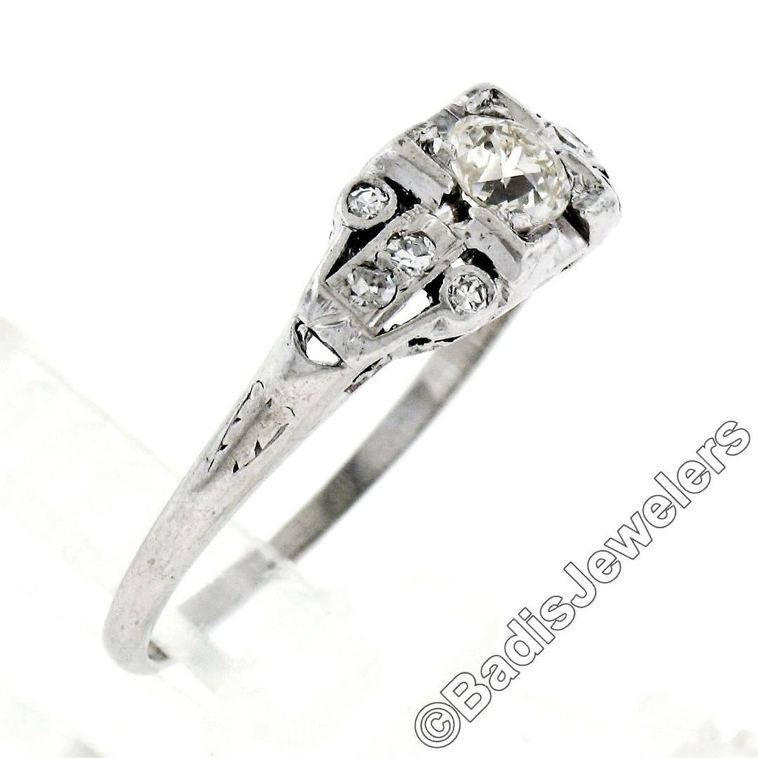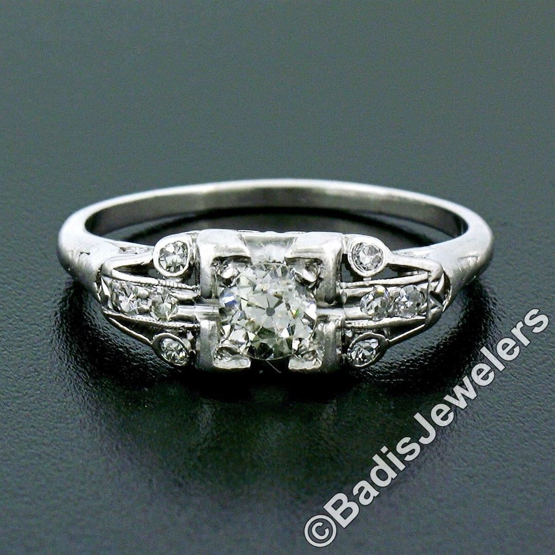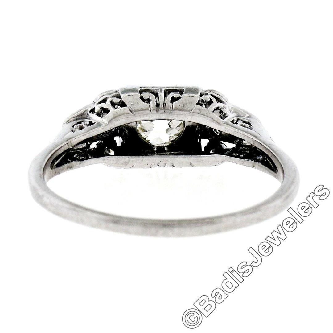 A platinum art deco period ring featuring a 0.30ct old European cut diamond (J - VS2) prong set atits center among 0.20ctw of bezel and pave set round single cut diamonds (G - VS1/VS2). The ring is size 7.0, weighs a total of 3.83 grams, and measures 6.35mm wide.