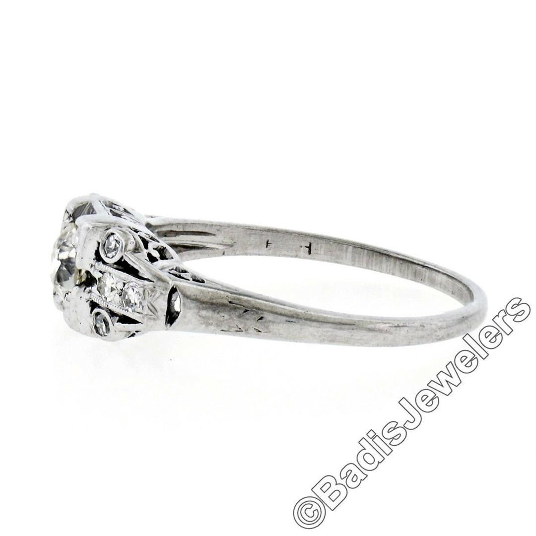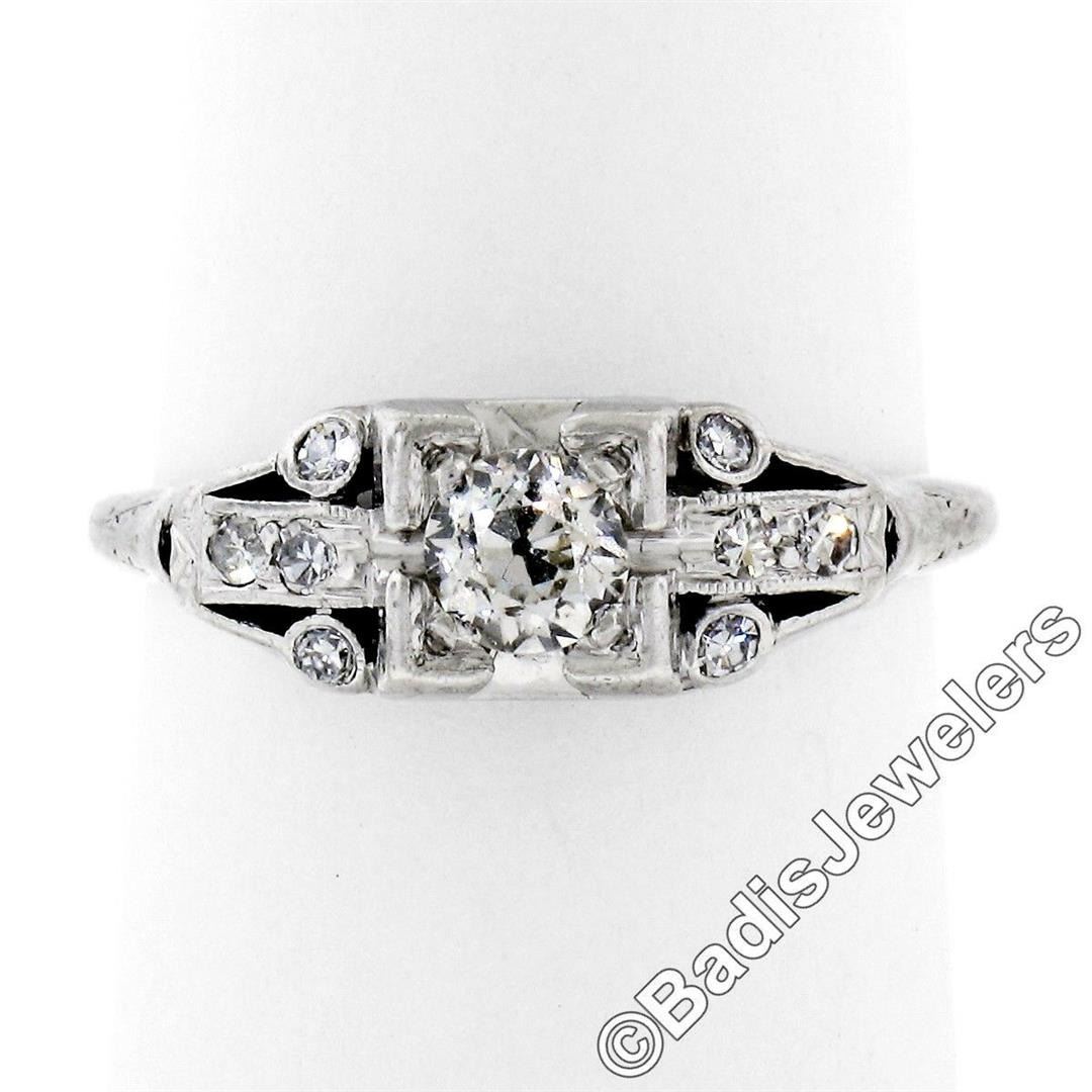 A platinum art deco period ring featuring a 0.30ct old European cut diamond (J - VS2) prong set atits center among 0.20ctw of bezel and pave set round single cut diamonds (G - VS1/VS2). The ring is size 7.0, weighs a total of 3.83 grams, and measures 6.35mm wide.