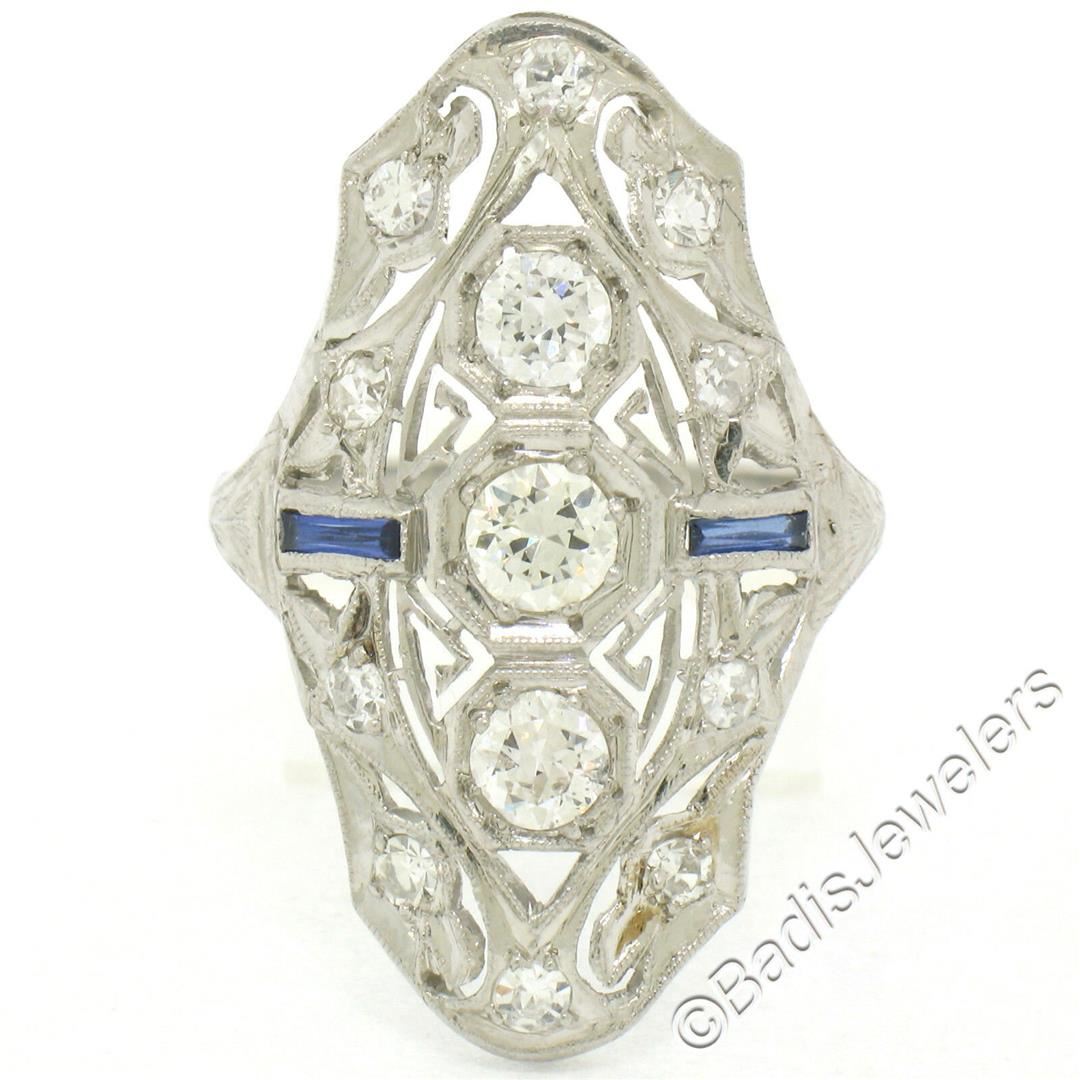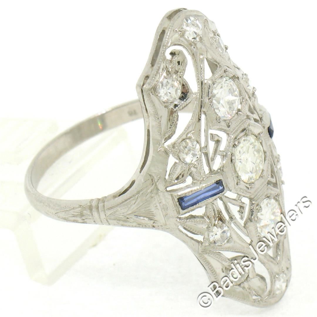 An art deco period platinum dinner ring with 1.20ctw of round diamonds (F/G - VS1 to SI1) and synthetic sapphire accents. The ring is size 7.5, weighs a total of 5.0 grams, and measures 29.1mm wide.