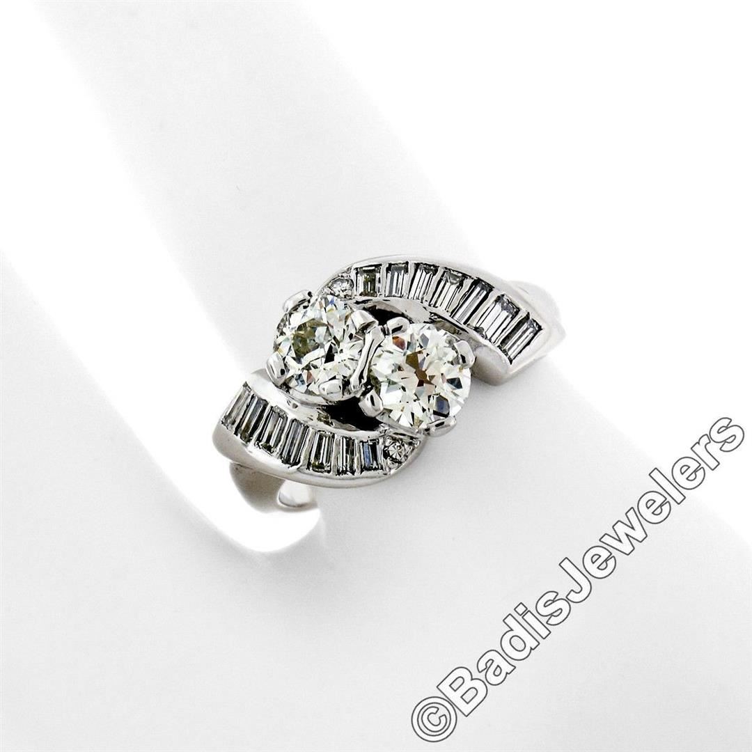 A platinum art deco period bypass ring featuring a pair of old European cut diamonds (1.03ctw; I/J - VVS2/VS1) accented by 0.49ctw of baguette and round single cut diamonds (F/G - VVS2 to VS2). The ring is size 4.5, weighs a total of 6.56 grams, and measures 10.65mm wide.
