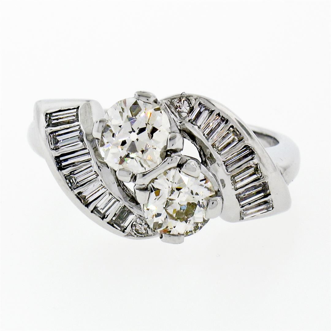 A platinum art deco period bypass ring featuring a pair of old European cut diamonds (1.03ctw; I/J - VVS2/VS1) accented by 0.49ctw of baguette and round single cut diamonds (F/G - VVS2 to VS2). The ring is size 4.5, weighs a total of 6.56 grams, and measures 10.65mm wide.