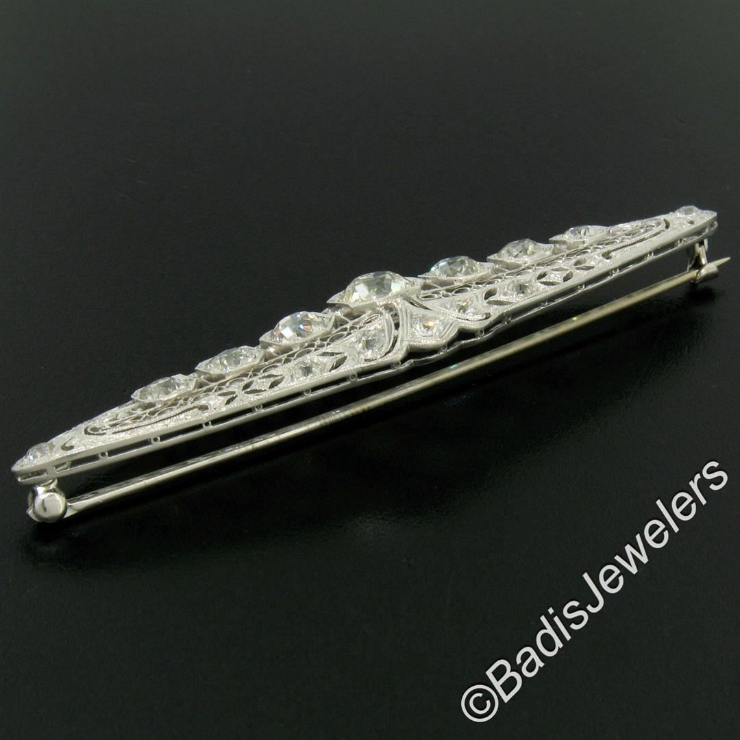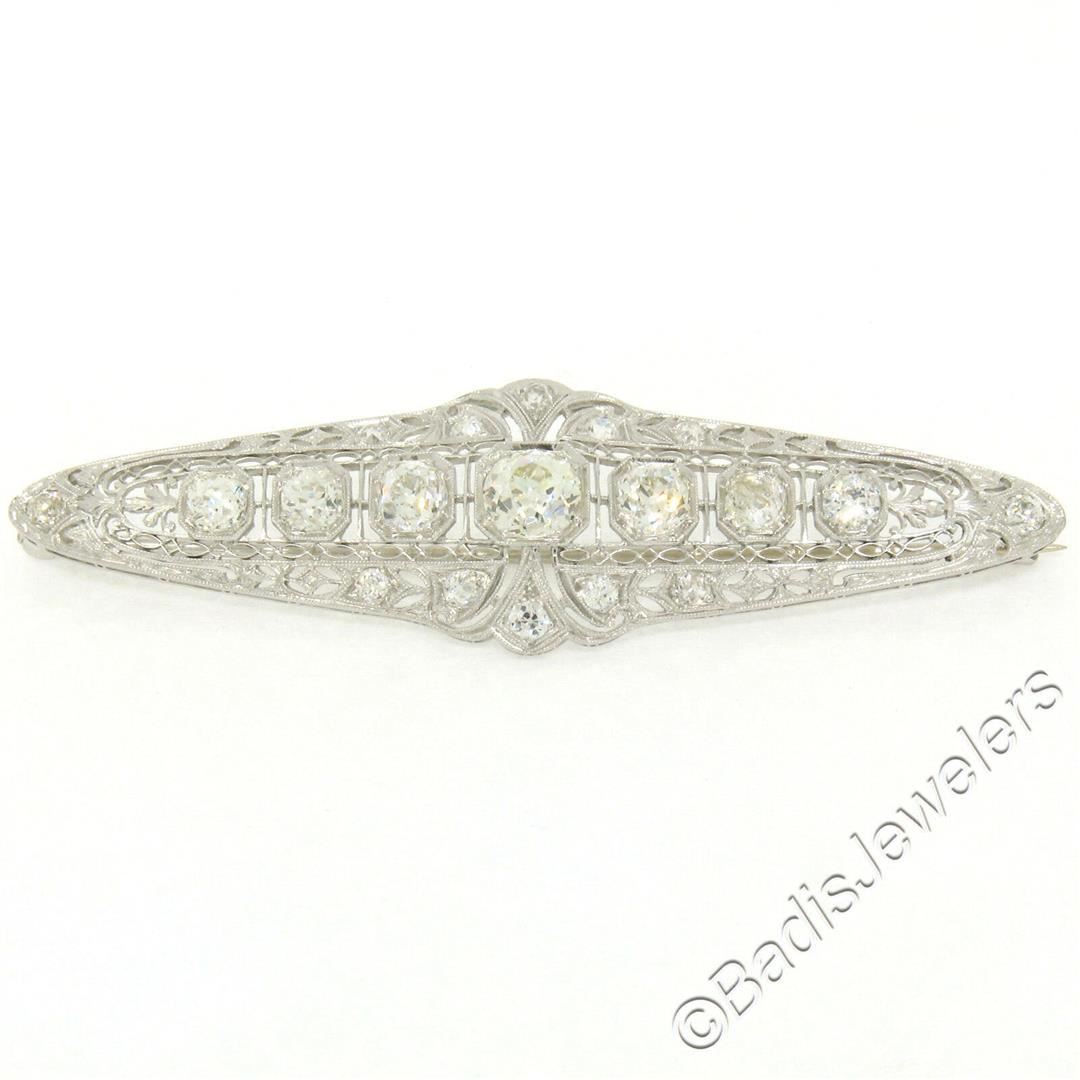 An art deco period platinum filigree brooch with a central 1.58ct old European cut diamond (K - SI1) surrounded by 4.42ctw of European and mine cut diamonds (G to I - VS2 to SI2). Measures 21.10x75.05mm and weighs a total of 12.84 grams.