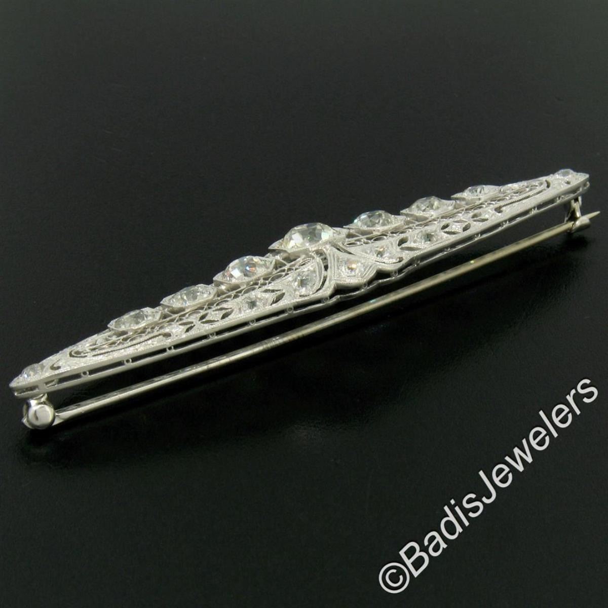 An art deco period platinum filigree brooch with a central 1.58ct old European cut diamond (K - SI1) surrounded by 4.42ctw of European and mine cut diamonds (G to I - VS2 to SI2). Measures 21.10x75.05mm and weighs a total of 12.84 grams.