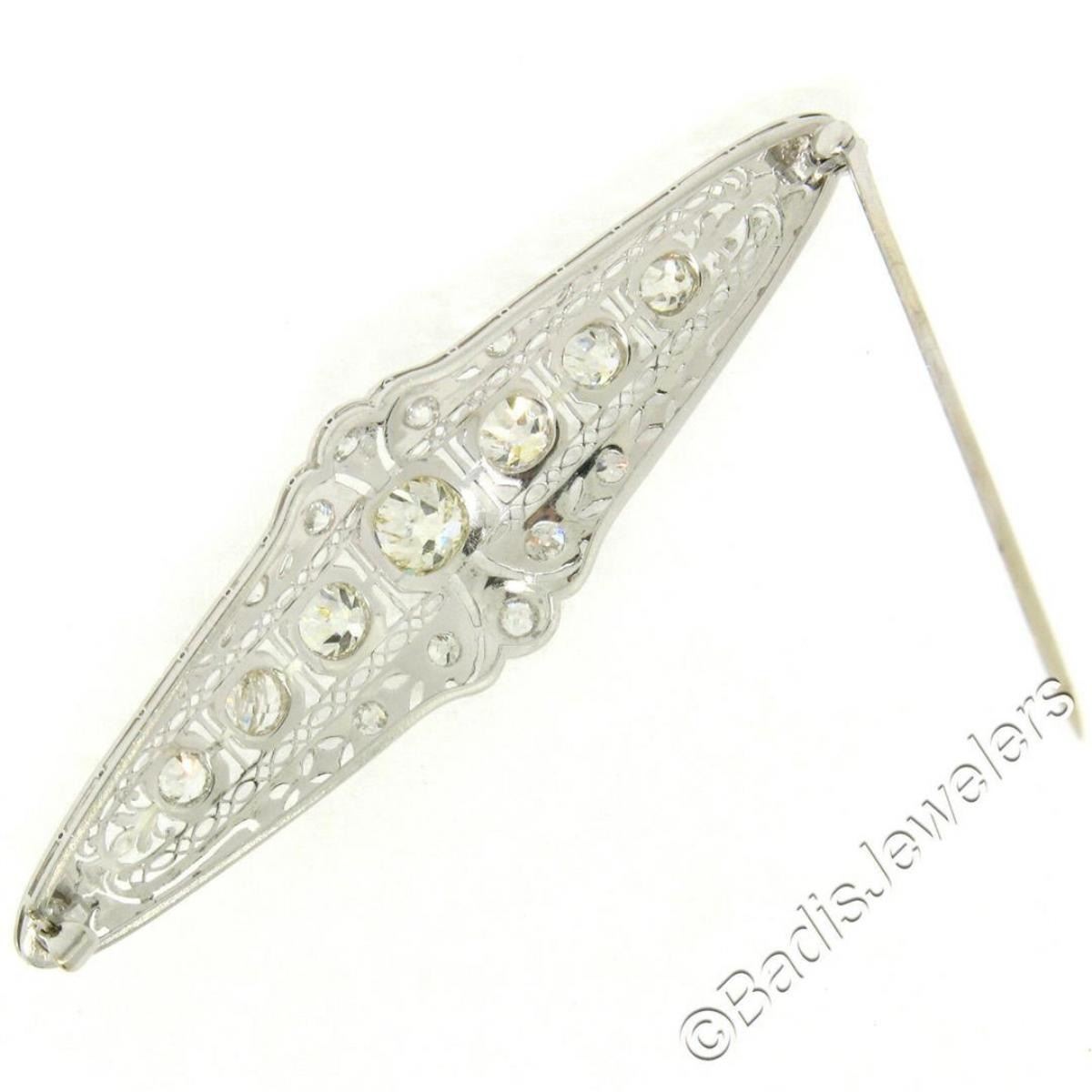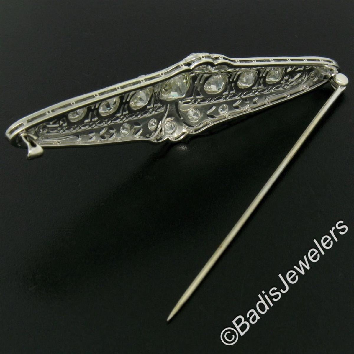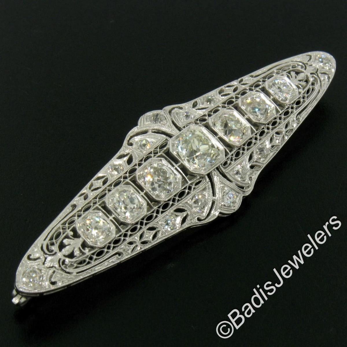 An art deco period platinum filigree brooch with a central 1.58ct old European cut diamond (K - SI1) surrounded by 4.42ctw of European and mine cut diamonds (G to I - VS2 to SI2). Measures 21.10x75.05mm and weighs a total of 12.84 grams.