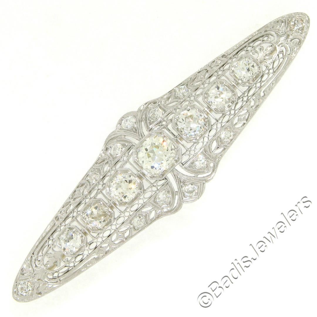 An art deco period platinum filigree brooch with a central 1.58ct old European cut diamond (K - SI1) surrounded by 4.42ctw of European and mine cut diamonds (G to I - VS2 to SI2). Measures 21.10x75.05mm and weighs a total of 12.84 grams.