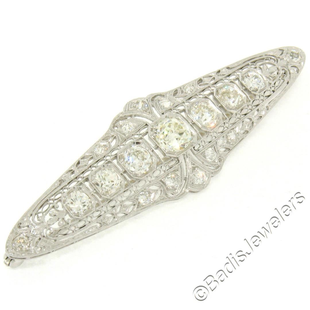 An art deco period platinum filigree brooch with a central 1.58ct old European cut diamond (K - SI1) surrounded by 4.42ctw of European and mine cut diamonds (G to I - VS2 to SI2). Measures 21.10x75.05mm and weighs a total of 12.84 grams.