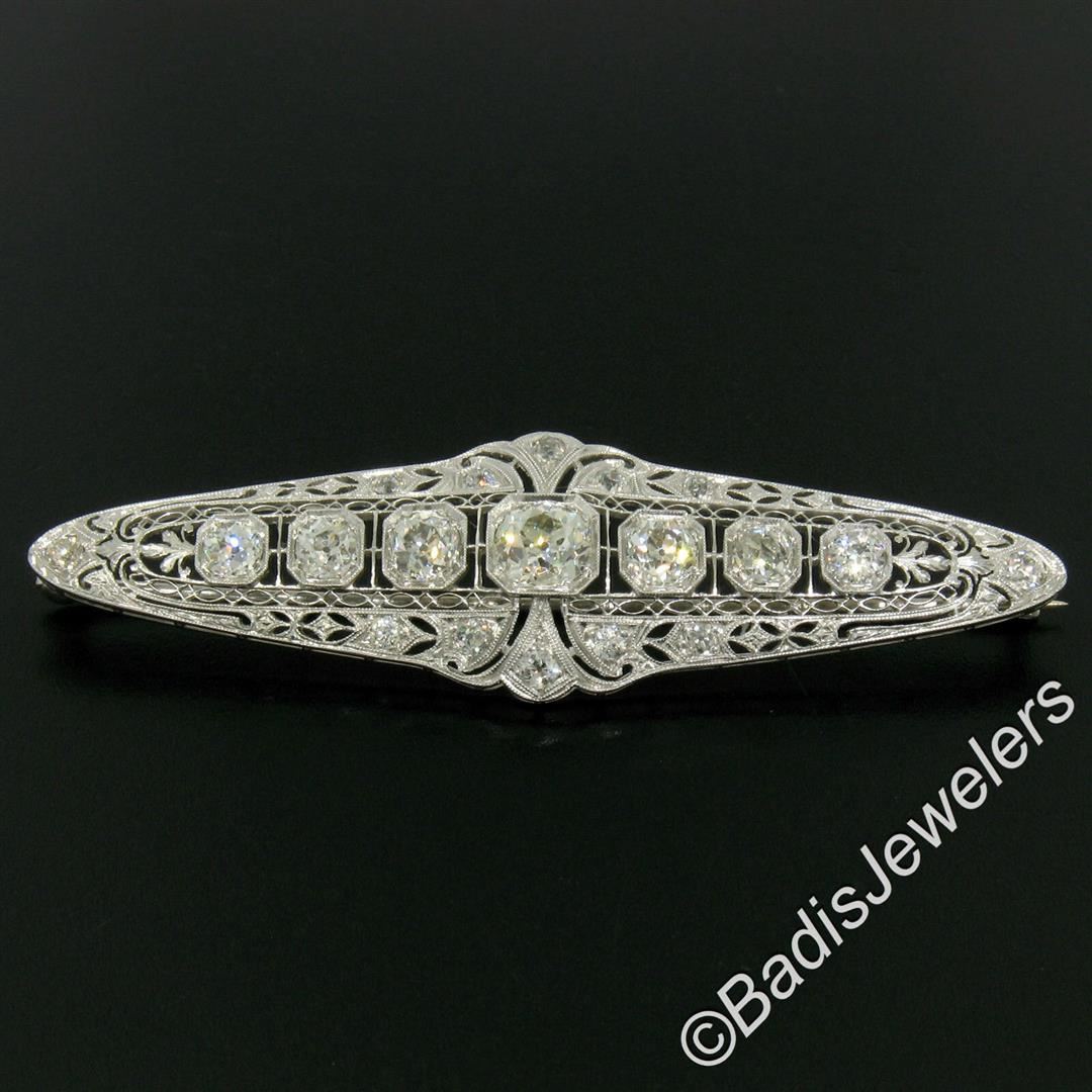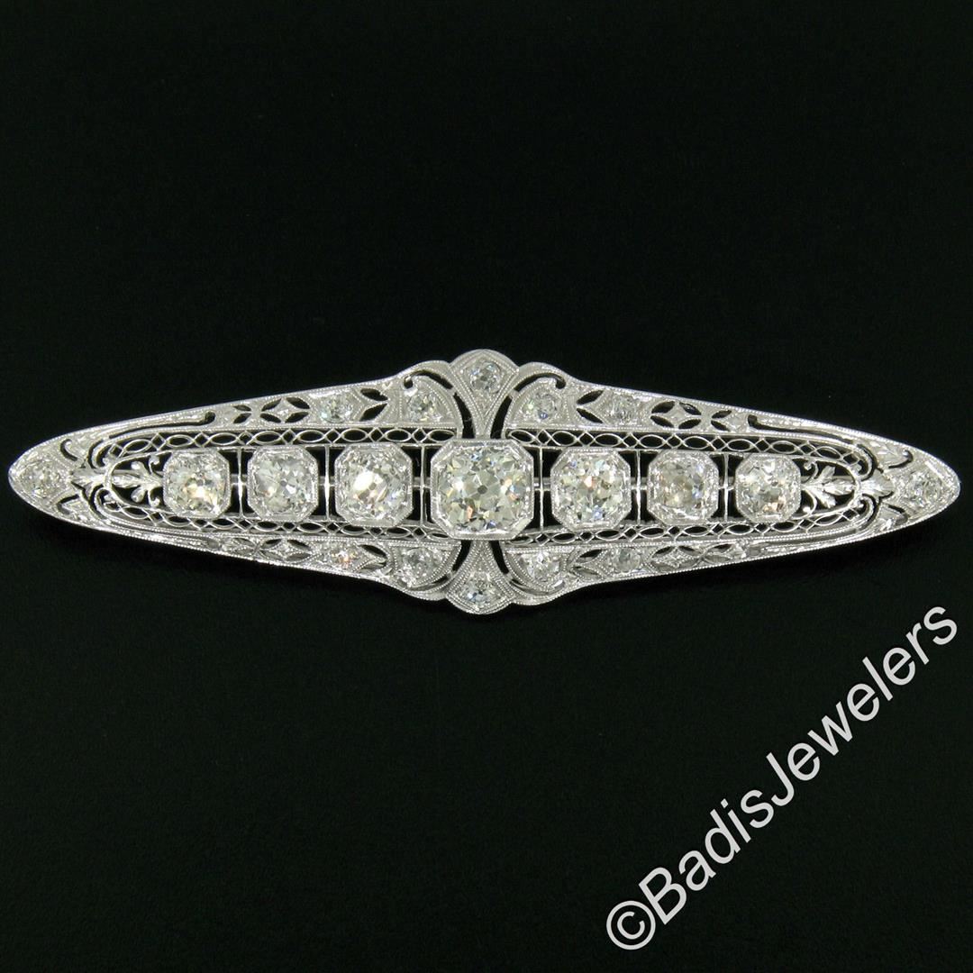 An art deco period platinum filigree brooch with a central 1.58ct old European cut diamond (K - SI1) surrounded by 4.42ctw of European and mine cut diamonds (G to I - VS2 to SI2). Measures 21.10x75.05mm and weighs a total of 12.84 grams.