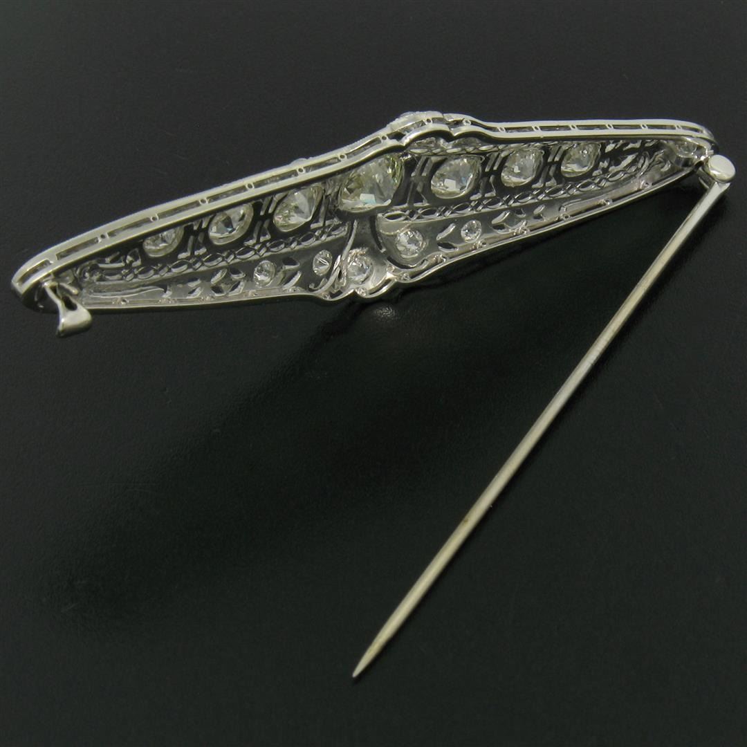 An art deco period platinum filigree brooch with a central 1.58ct old European cut diamond (K - SI1) surrounded by 4.42ctw of European and mine cut diamonds (G to I - VS2 to SI2). Measures 21.10x75.05mm and weighs a total of 12.84 grams.