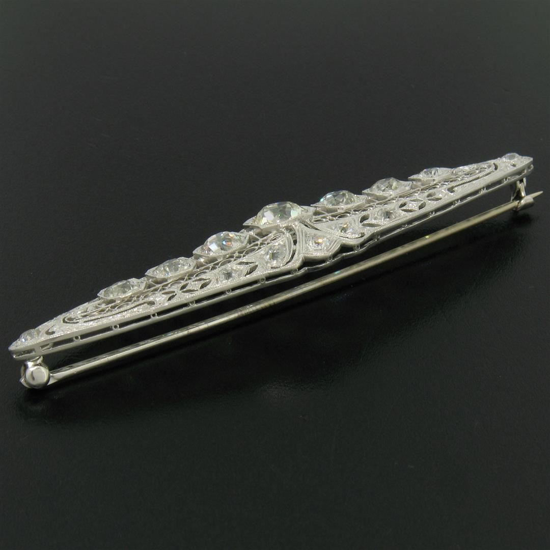 An art deco period platinum filigree brooch with a central 1.58ct old European cut diamond (K - SI1) surrounded by 4.42ctw of European and mine cut diamonds (G to I - VS2 to SI2). Measures 21.10x75.05mm and weighs a total of 12.84 grams.