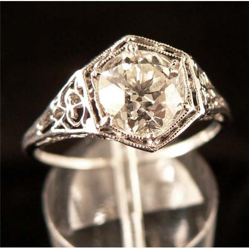 This an impressive and stunning lady?s solitaire ring at 10.21mm across the top. The octagonal top is set with a single round old European cut diamond. The sides are pierced in a scroll floral motif. The diamond is 1.55 carat with clarity SI1 and color H-I. Total weight is 2.2 grams. Circa 1925. Ring size 7 ½. The ring is in excellent condition.