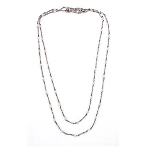 Exceptionally beautiful art deco platinum chain with 45 white pearls with high luster. It is 45" long, can be worn as a double tier necklace or one long one. Each pearl measures 2mm. Total weight 10.6dwt (16.5g)